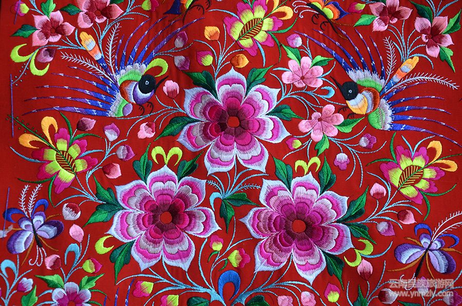 彝族刺繡方法看似簡(jiǎn)單,但技術(shù)水平較難。先在紙上描繪出花、草、樹、鳥、蟲、魚、火等千姿百態(tài)、栩栩如生的精美圖案,然后粘貼于準(zhǔn)備好的布料上,憑著繡娘的想象和審美需要,對(duì)照?qǐng)D案選用不同顏色、不同粗細(xì)、不同材質(zhì)的繡線搭配,最后再通過手工一針一線進(jìn)行繡制。彝族刺繡的婦女想象力豐富,描繪的圖案顏色繁復(fù),隨心所欲而如云出于岫,沒有固定的模式,自然清新質(zhì)樸。茶花代表孩子將來聰明伶俐、氣質(zhì)非凡;蝴蝶代表孩子將來能找到個(gè)好人家、榮華富貴、吉祥如意等等。