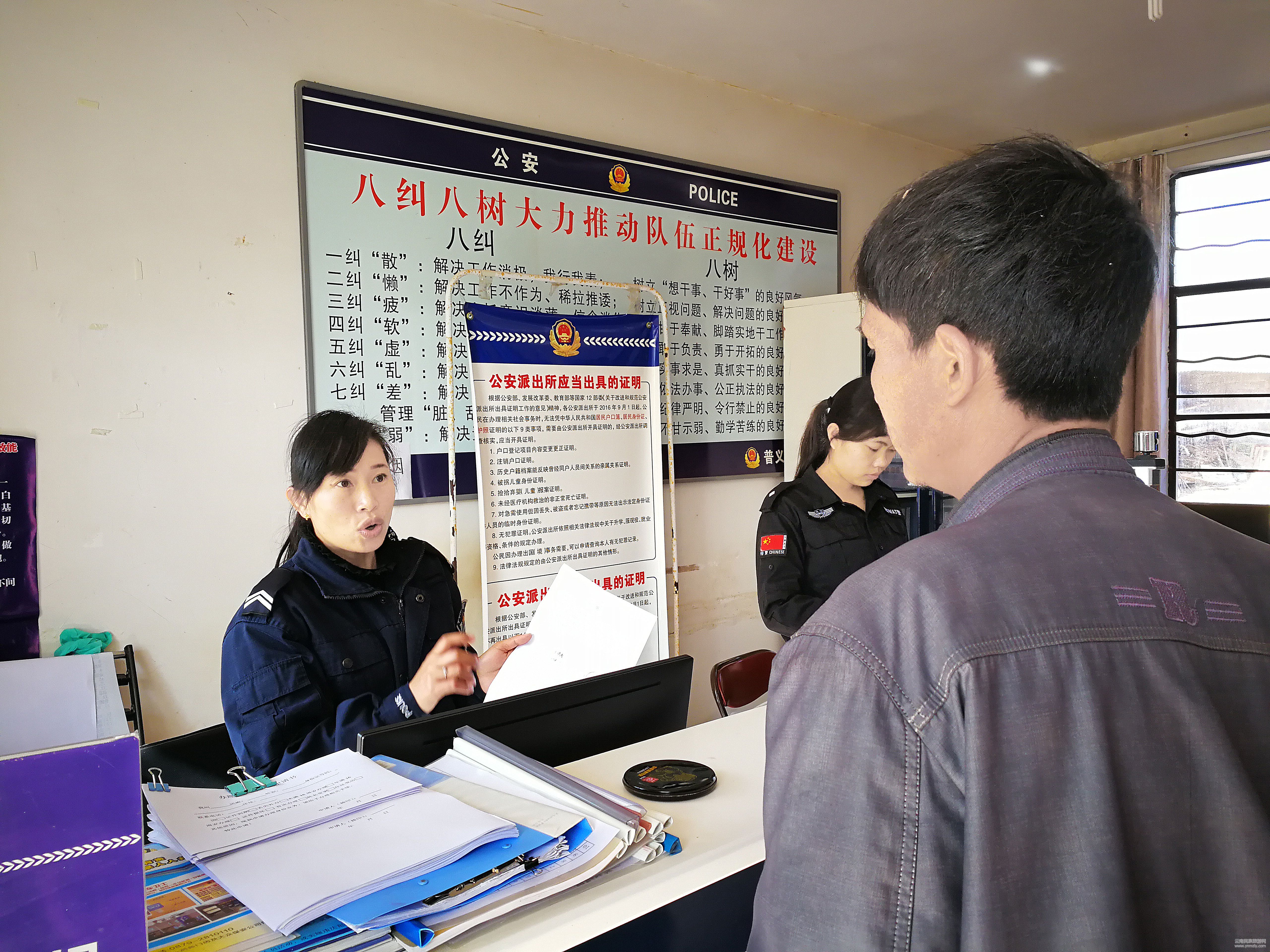 普義派出所距離寧洱縣城50多公里,警力及辦公資源有限。派出所10余平米的戶籍辦公區(qū)域里,雖然擁擠但時常“高朋滿座”,兩朵“警花”撐起了最繁忙的戶籍窗口。