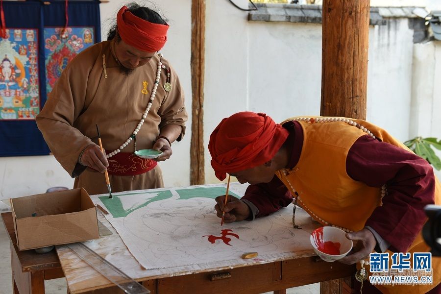 和嘉龍和楊正元一起上顏色。東巴畫常用紅、黃、綠、白、黑五種顏色,象征金、木、水、火、土五行,認(rèn)為五行是構(gòu)成世間萬物的基本物質(zhì),其中蘊(yùn)含了納西族樸素的原始哲學(xué)觀念。(新華網(wǎng) 韓文萍、馬航/文 李寧/圖)