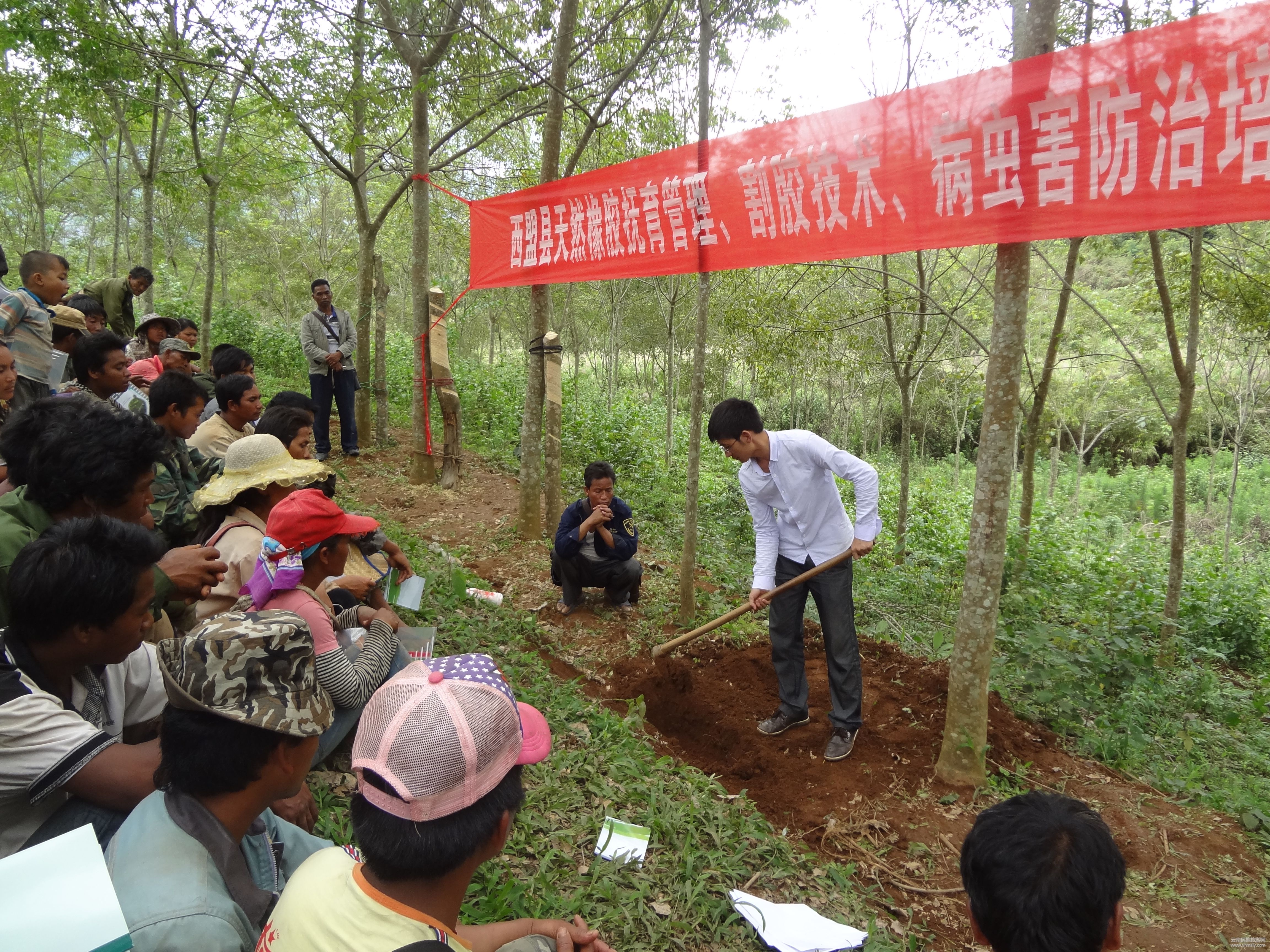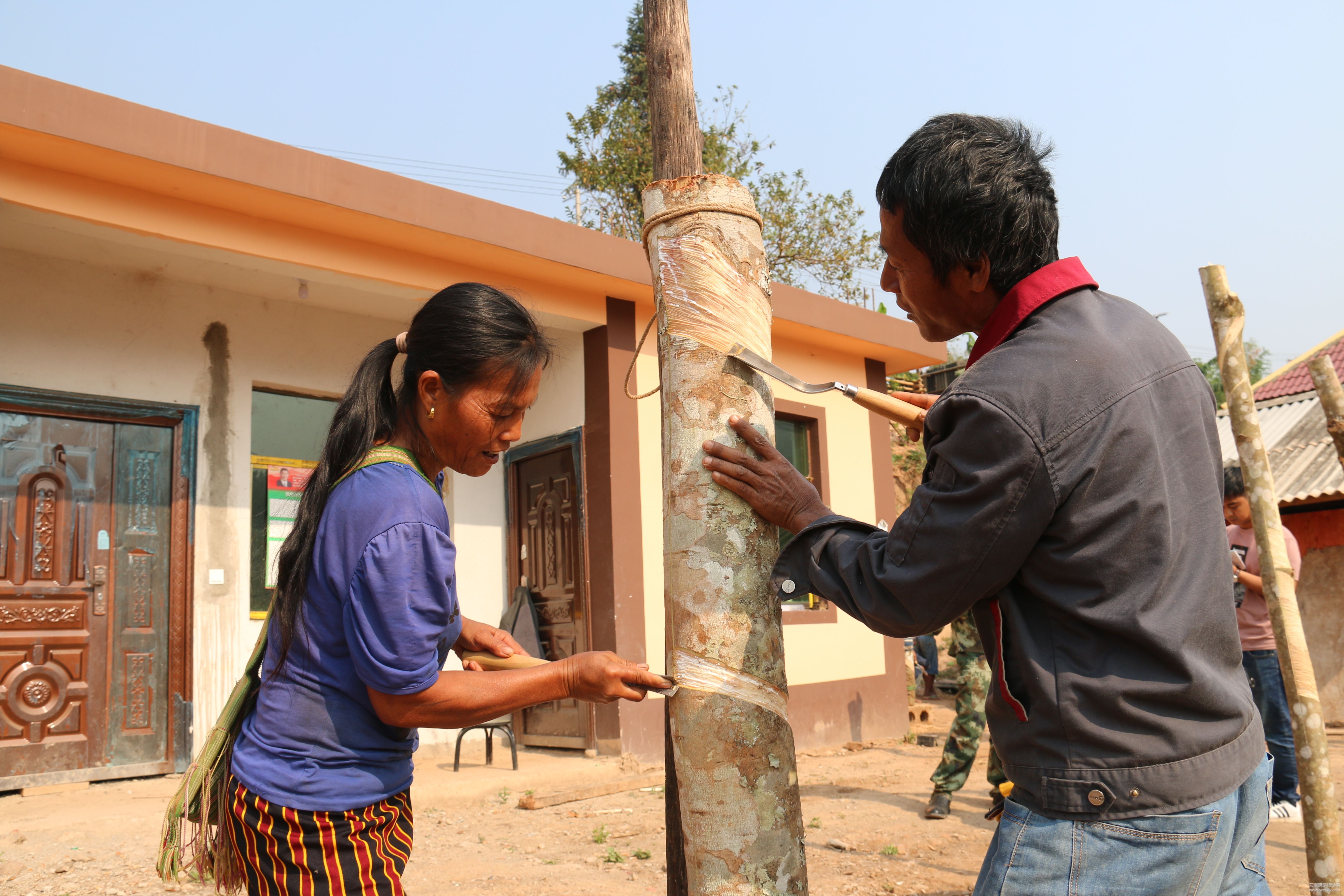 “你的刀法不對,刻得太深了,這樣會傷到樹的表皮,出膠量也少。”看一位長者刀法不對,培訓老師周文云接過膠刀,嫻熟地表演著。在身邊的幾十名群眾中,周文云最得意的是一位傣族婦女艾坡,她是這群“學員”里學的最快、刀法最好的一位。