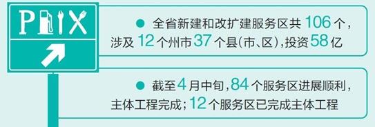 高速路服務(wù)區(qū)不僅是休息的驛站、服務(wù)的載體,更是旅游的名片、形象的窗口。一年前,我省把高速路服務(wù)區(qū)整治提升作為全省交通運(yùn)輸工作的重要任務(wù),切實(shí)抓緊抓好。省交通廳積極貫徹落實(shí)部署,研究制定高速公路服務(wù)區(qū)整治提升一年行動(dòng)計(jì)劃,深入開(kāi)展改擴(kuò)建和新建工程、基礎(chǔ)設(shè)施提升、環(huán)境衛(wèi)生整治。根據(jù)省政府統(tǒng)一規(guī)劃,全省新建和改擴(kuò)建服務(wù)區(qū)共106個(gè),其中改擴(kuò)建80個(gè),新建26個(gè),涉及12個(gè)州市37個(gè)縣(市、區(qū)),投資概算58億元。