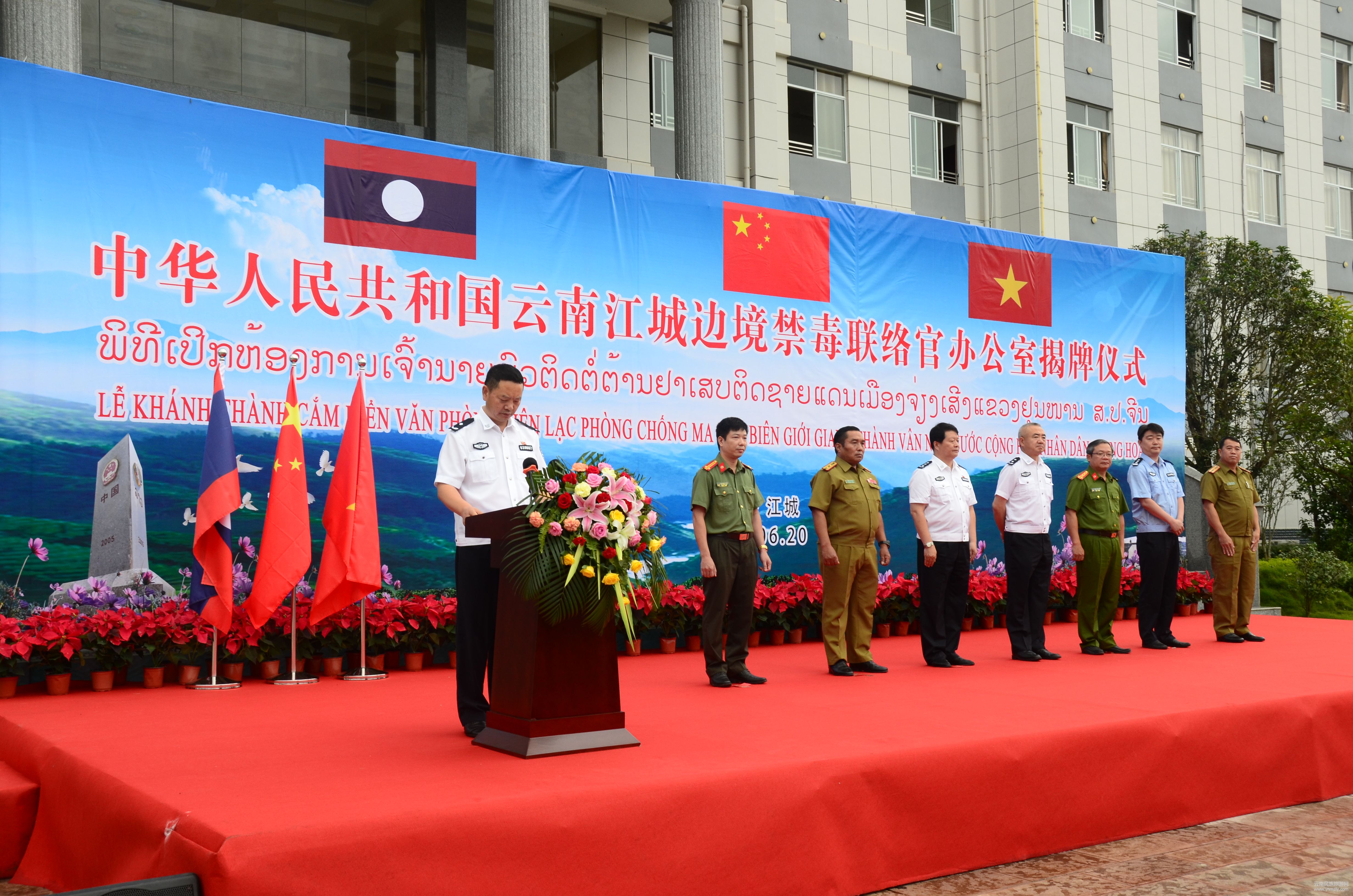 “在公安部、省公安廳、普洱市公安局的關(guān)心支持下,2017年6月1日批準(zhǔn)并于6月20日掛牌成立。聯(lián)絡(luò)官辦公室設(shè)在江城縣公安局,確定了8名市、縣禁毒辦領(lǐng)導(dǎo)及相關(guān)部門人員擔(dān)任聯(lián)絡(luò)官,配備了老、越翻譯專職人員,正式與老撾、越南聯(lián)絡(luò)官開展了禁毒執(zhí)法合作。”