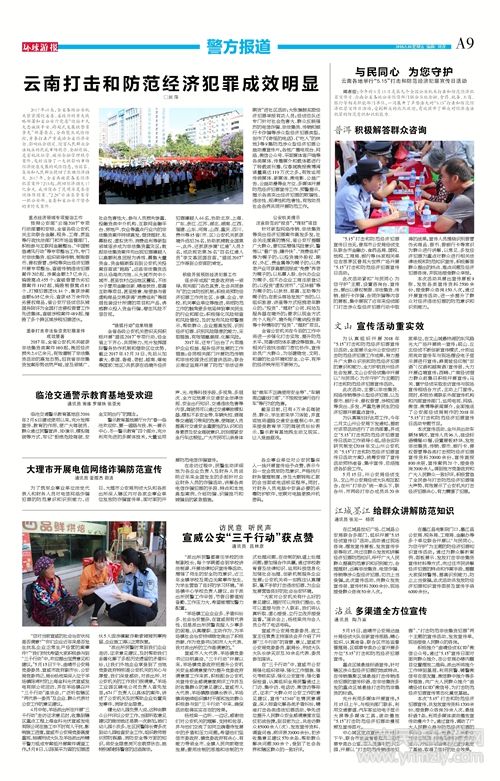 2017年,還專門出臺了六項維護企業(yè)權(quán)益、服務(wù)經(jīng)濟發(fā)展的工作措施;會同相關(guān)部門開展防范傳銷和非法校園貸巡回宣講活動;聯(lián)合云南證監(jiān)局開展了防范“非法證券期貨”進社區(qū)活動;大張旗鼓獎勵經(jīng)濟犯罪舉報有功人員;經(jīng)偵總隊還專門針對社會危害大、群眾反映強烈的電信詐騙、非法集資、傳銷和銀行卡詐騙等涉眾型經(jīng)濟犯罪類型,創(chuàng)作了《奇怪的電話》、《“吃人”的林地》等9集防范涉眾型經(jīng)濟犯罪公益動漫宣傳片。各地廣播電視臺、網(wǎng)絡(luò)、微信公眾號、平面媒體客戶端等各類媒體、傳播媒介和載體都進行了轉(zhuǎn)載或刊播,僅春城晚報微博閱讀量高達119萬次之多。有效運用傳統(tǒng)媒體、新媒體、微電影、公益廣告、公益動漫等全方位、多媒體開展防范經(jīng)濟犯罪宣傳工作、預(yù)警提示,揭示各類突出經(jīng)濟犯罪的欺騙性、違法性、規(guī)律性和危害性,有效動員社會各界共同開展防范工作。