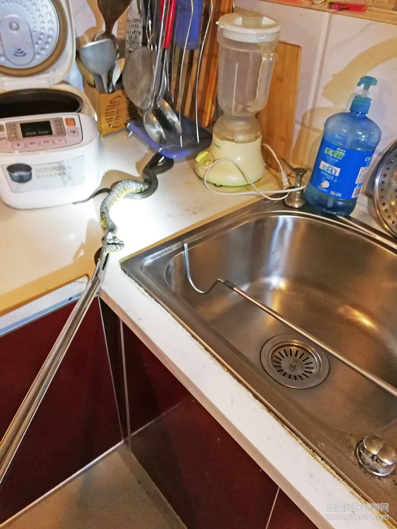 6月20日22:30分許,大理古城的楊先生已準(zhǔn)備就寢,突然聽到廚房里傳來異常的聲音,以為是家里進(jìn)老鼠了,于是起身去廚房檢查,誰知剛提起放置鍋鏟、湯勺等廚具的收納架,就鉆出一條菜花蛇,毫無心理準(zhǔn)備的楊先生嚇壞了,于是報警請求救助。