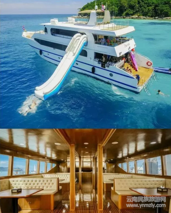 資料顯示,“鳳凰號(hào)”寬8米,長(zhǎng)38米,最大載客量為200人。其內(nèi)部分為4層,底倉是廚房和休息室,首層為餐廳和潛水裝備區(qū),二層為船長(zhǎng)室、露天、室內(nèi)休息室和兒童戲水區(qū);三層則為陽光甲板,配備按摩浴缸,同時(shí)設(shè)有滑梯,游客可以體驗(yàn)直沖入海。