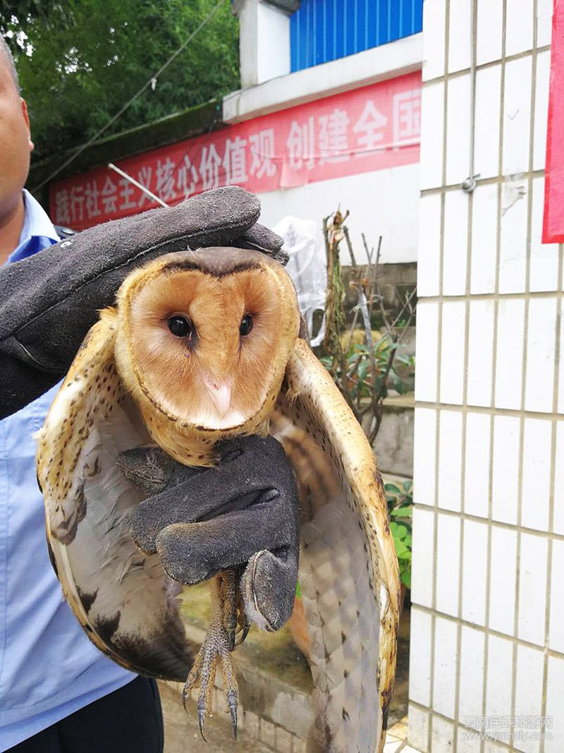 經(jīng)民警查找相關(guān)資料,確定這只猴子面相的鳥學(xué)名叫草鸮,又稱猴面鷹,是一種中型猛禽,屬國家二級保護(hù)野生動物。7月1日上午,民警將這只小動物送到昆明市瀕危動植物收容拯救中心進(jìn)行救治。