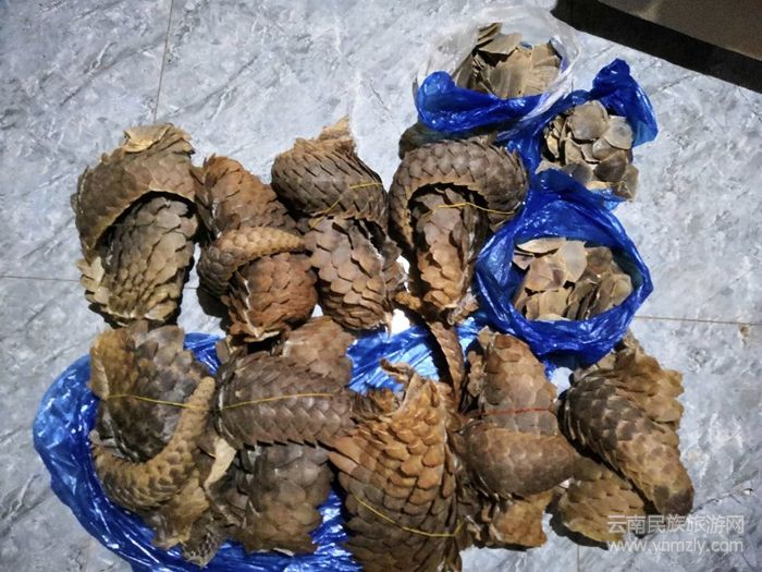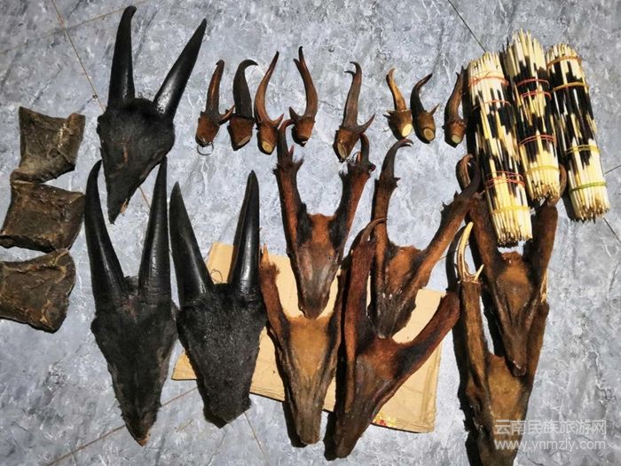 經(jīng)清點(diǎn),共查獲疑似穿山甲皮9套、穿山甲片269片;麂子角(面部)6副;麂子腳8件;豪豬刺510根;野牛膽2個;巖羊角3對;象皮3塊。