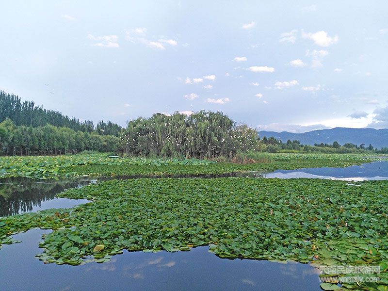 柳樹、水杉圍繞在草海四周,荷花連接木走欄,前面是水的世界、花的海洋、鳥的天堂。