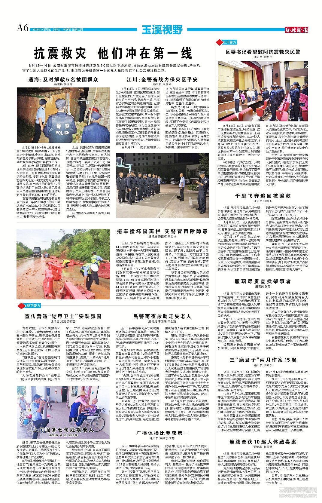 8月13—14日,云南省玉溪市通??h連續(xù)發(fā)生5.0級及以下級地震,導致通海及周邊縣域部分房屋受損,嚴重危害了當?shù)厝嗣袢罕姷纳a生活,玉溪市公安機關第一時間投入搶險救災和社會治安維穩(wěn)工作。