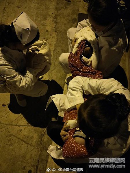 上圖為:通??h人民醫(yī)院的護士把新生兒抱到了室外避震。