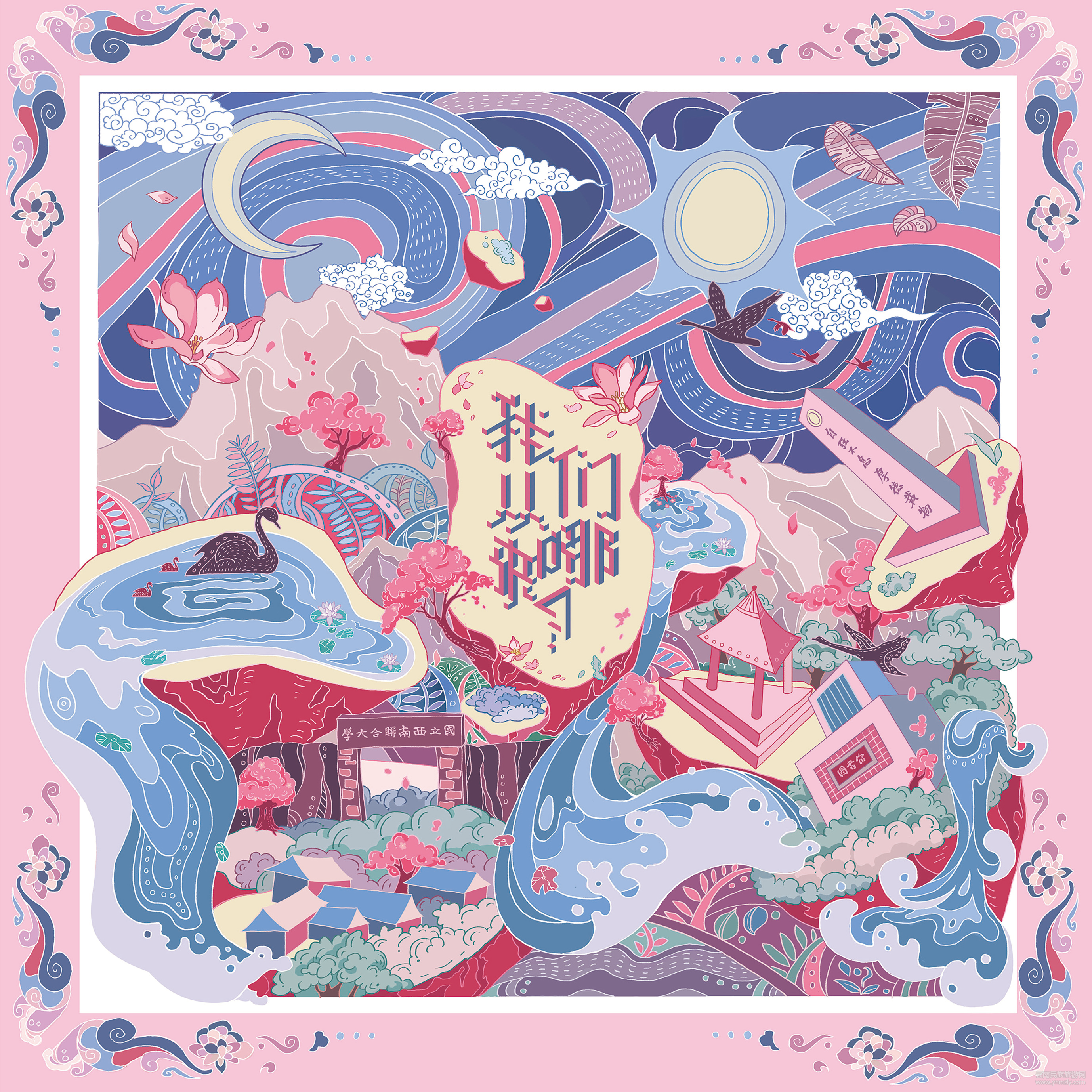 2.《我們從哪來》主題文創(chuàng)設(shè)計作品——分別從西南聯(lián)大校舍變遷、知名校友、校園美景三方面入手設(shè)計為插畫,并制作平面設(shè)計衍生品。“校舍變遷”采用三座浮島表現(xiàn)不同時空的校園,并用老火車和高鐵連接,意味著時代變遷,時空密不可分。“知名校友”是用波普風格對聞一多、梅貽琦、楊振寧等六位知名校友的形象進行設(shè)計。“校園美景”是對校園特色植物和建筑做抽象化處理,設(shè)計為圖案運用于產(chǎn)品中。