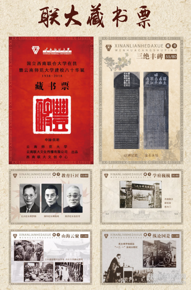 3. 發(fā)行“西南聯(lián)大藏書票”由云南師范大學資產(chǎn)經(jīng)營有限責任公司與美術(shù)學院共同開發(fā)設(shè)計的系列藏書票80枚,寓西南聯(lián)大八十華誕之意。全套三編,首編呈中國大學精神傳統(tǒng),庚續(xù)文明教化血脈;中編現(xiàn)炎黃學人,國難興邦的風骨;下編表當代學子薪火相傳、弦歌不輟、踐文化復興的腳步。堪稱一部濃縮的西南聯(lián)大校史,是當今弘揚中華傳統(tǒng)精神、構(gòu)建文化自信的實踐,極具收藏價值。