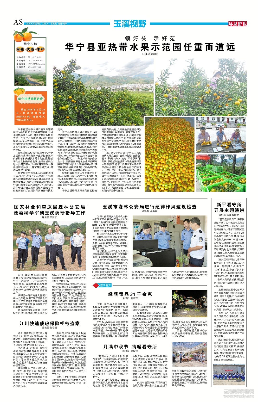 華寧縣亞熱帶水果示范園于2004年被國家農(nóng)業(yè)部評為“南亞熱帶作物名優(yōu)基地”,于2005年列為全縣柑橘標(biāo)準(zhǔn)化生產(chǎn)示范基地,于2015年建成市級柑橘莊園,于2016年被玉溪市列為柑橘危險(xiǎn)性病蟲害(黃龍病、潰瘍病、木虱、柑橘小實(shí)蠅)動(dòng)態(tài)監(jiān)測點(diǎn),同年建成自動(dòng)氣象監(jiān)測站,為華溪鎮(zhèn)柑橘生產(chǎn)管理提供氣象保障。2017年與云南農(nóng)業(yè)大學(xué)簽訂科技合作戰(zhàn)略協(xié)議,2018年縣政府與云南農(nóng)業(yè)大學(xué)、云南省高原特色農(nóng)業(yè)產(chǎn)業(yè)研究院簽訂縣校科技合作戰(zhàn)略框架協(xié)議,現(xiàn)已開展《柑橘根部灌溉》、《柑橘果園免耕》、《柑橘早花誘導(dǎo)》等六項(xiàng)試驗(yàn)。