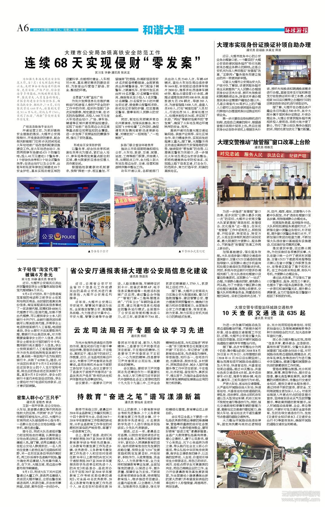 高鐵開通對改善大理交通運輸網(wǎng)絡、承接產(chǎn)業(yè)轉移、深化區(qū)域合作、助力精準扶貧、實現(xiàn)后發(fā)趕超意義重大。據(jù)了解,大理警方將主動適應高鐵時代安保維穩(wěn)的形勢,繼續(xù)保持“零發(fā)案”的態(tài)勢,以提高見警率為突破口,進一步強化火車站及周邊治安綜合整治,積極構建高鐵治安防控體系,實現(xiàn)路上路下信息互通、打擊合力、防范同步,努力打造平安、和諧的高鐵站區(qū)。(文章來源環(huán)球游報2018年9月14日第1157期A6)