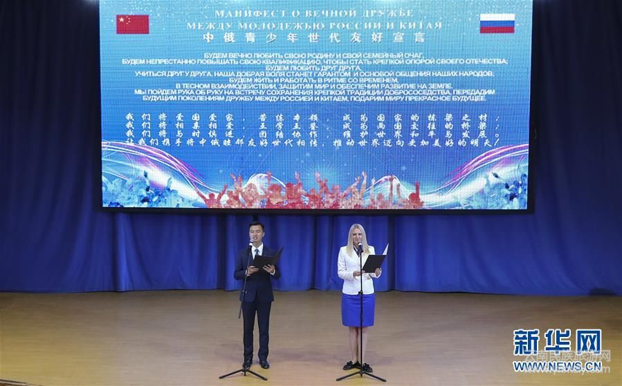 2018年9月12日,汶川地震后曾在兒童中心療養(yǎng)的北川男孩席浚斐(左)和中心輔導(dǎo)員娜塔莉亞共同宣讀《中俄青少年世代友好宣言》。 新華社記者謝環(huán)馳攝