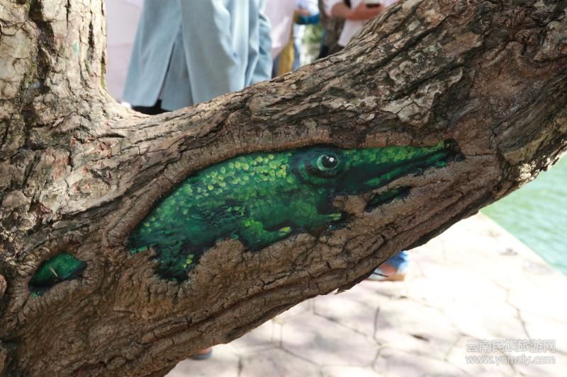 河邊的一根樹枝上,盤結(jié)著一些黃黑色的大蛇,那色澤、眼神,栩栩如生,若非你先知道那是彩繪,說不定以為它是一條真蛇呢;而另一棵樹上,樹干斷了的地方,一只貓頭鷹正坐在那兒,樹洞成了它的眼睛,樹樁成了它的臉……