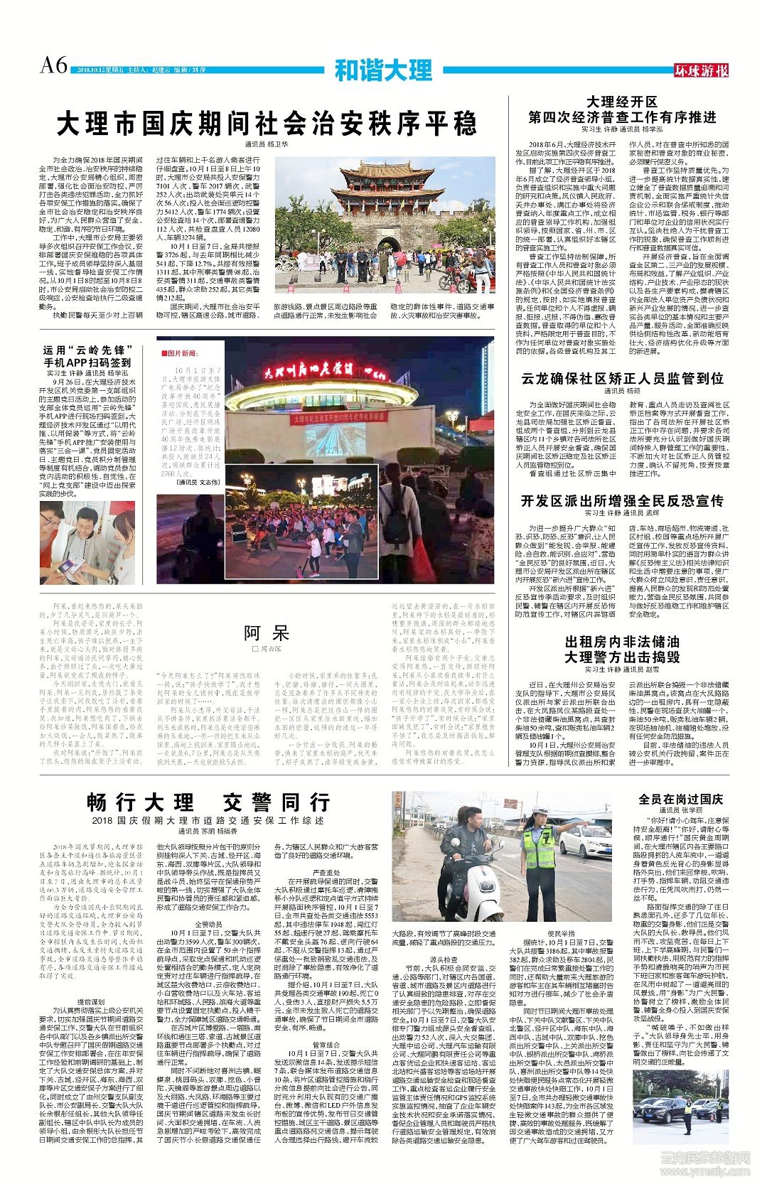 國(guó)慶期間,大理市社會(huì)治安平穩(wěn)可控,轄區(qū)高速公路、城市道路、旅游線(xiàn)路、景點(diǎn)景區(qū)周邊路段等重點(diǎn)道路通行正常,未發(fā)生影響社會(huì)穩(wěn)定的群體性事件、道路交通事故、火災(zāi)事故和治安災(zāi)害事故。(文章來(lái)源環(huán)球游報(bào)2018年10月12日第1160期A6版)