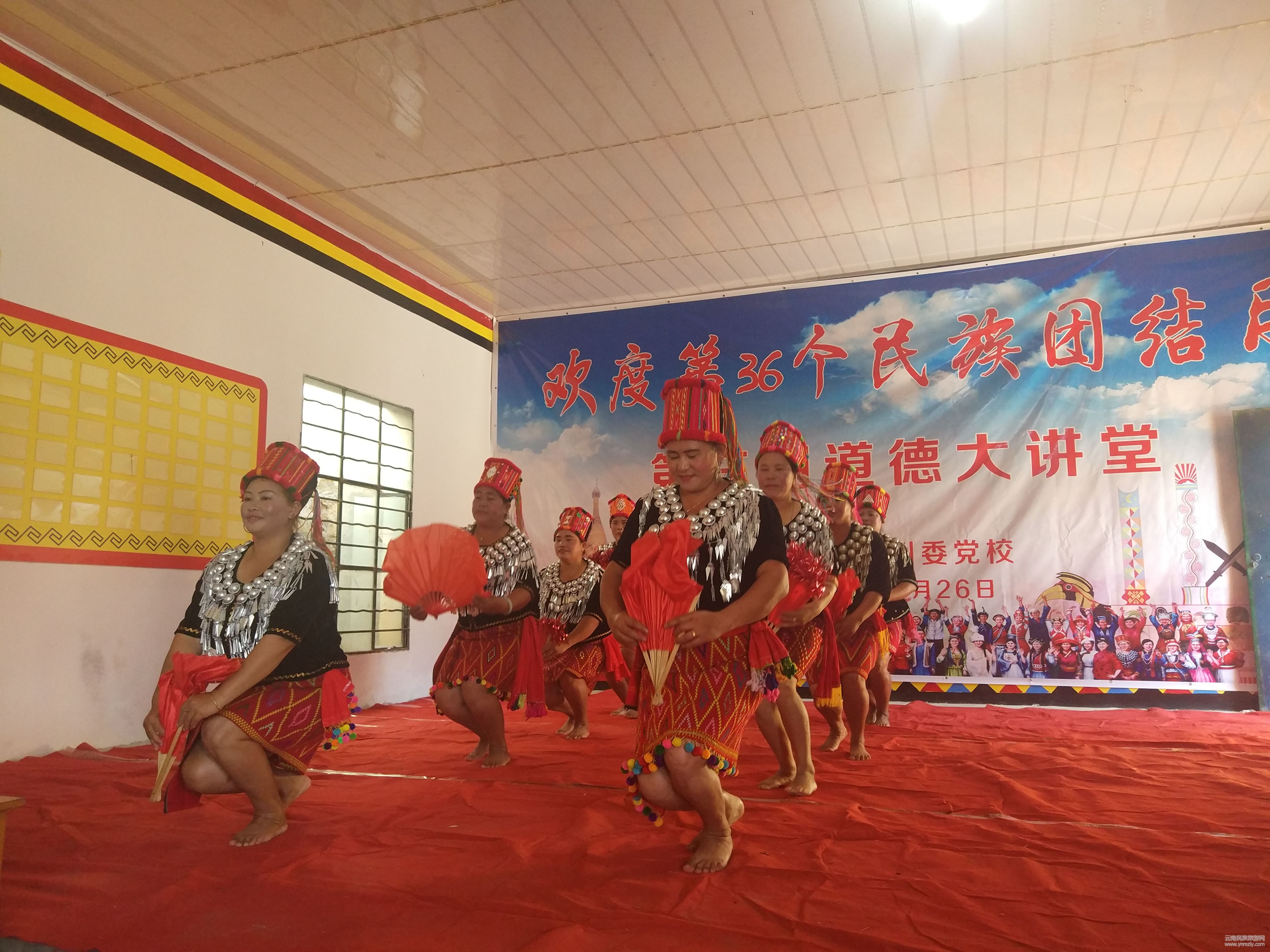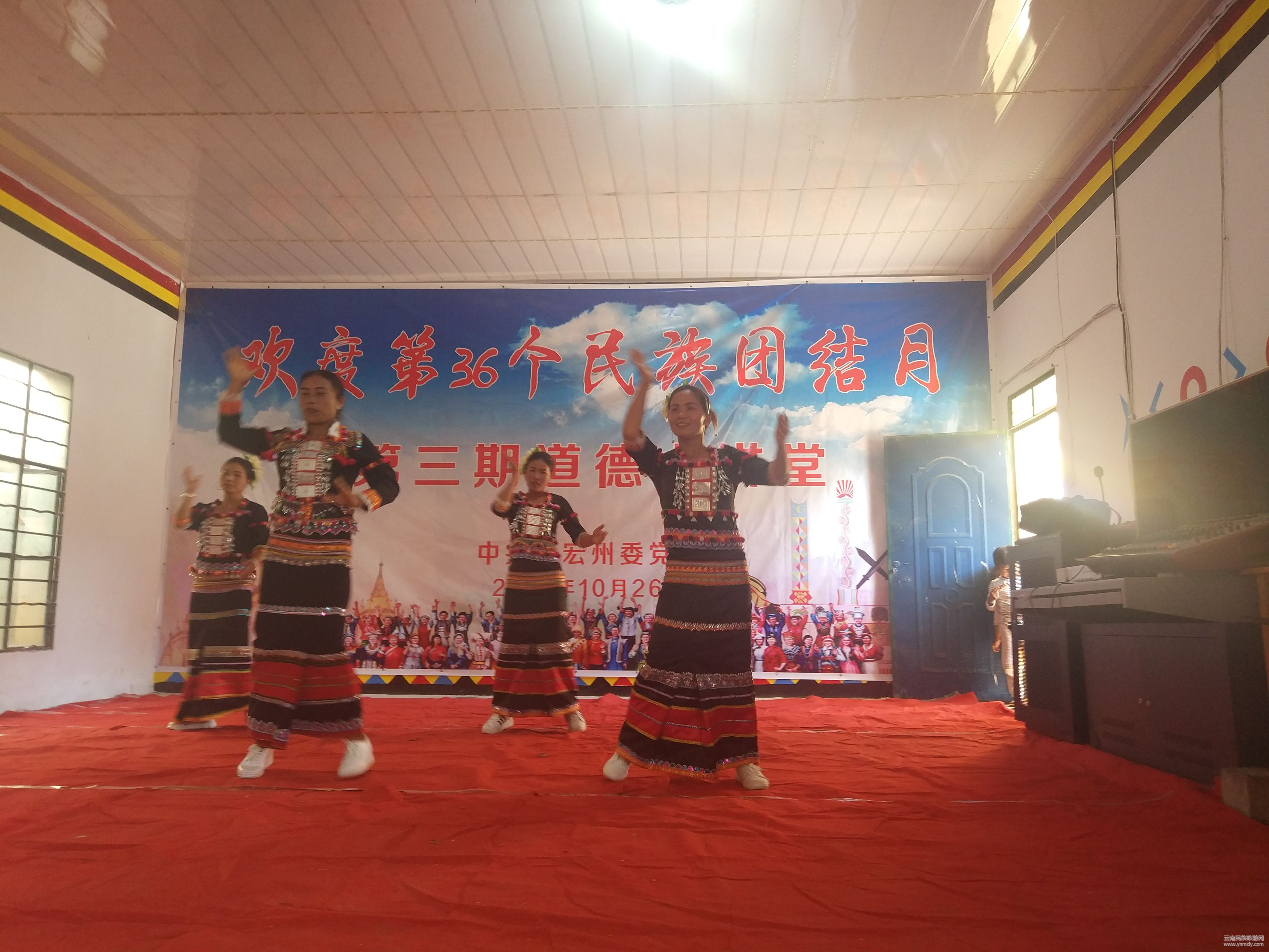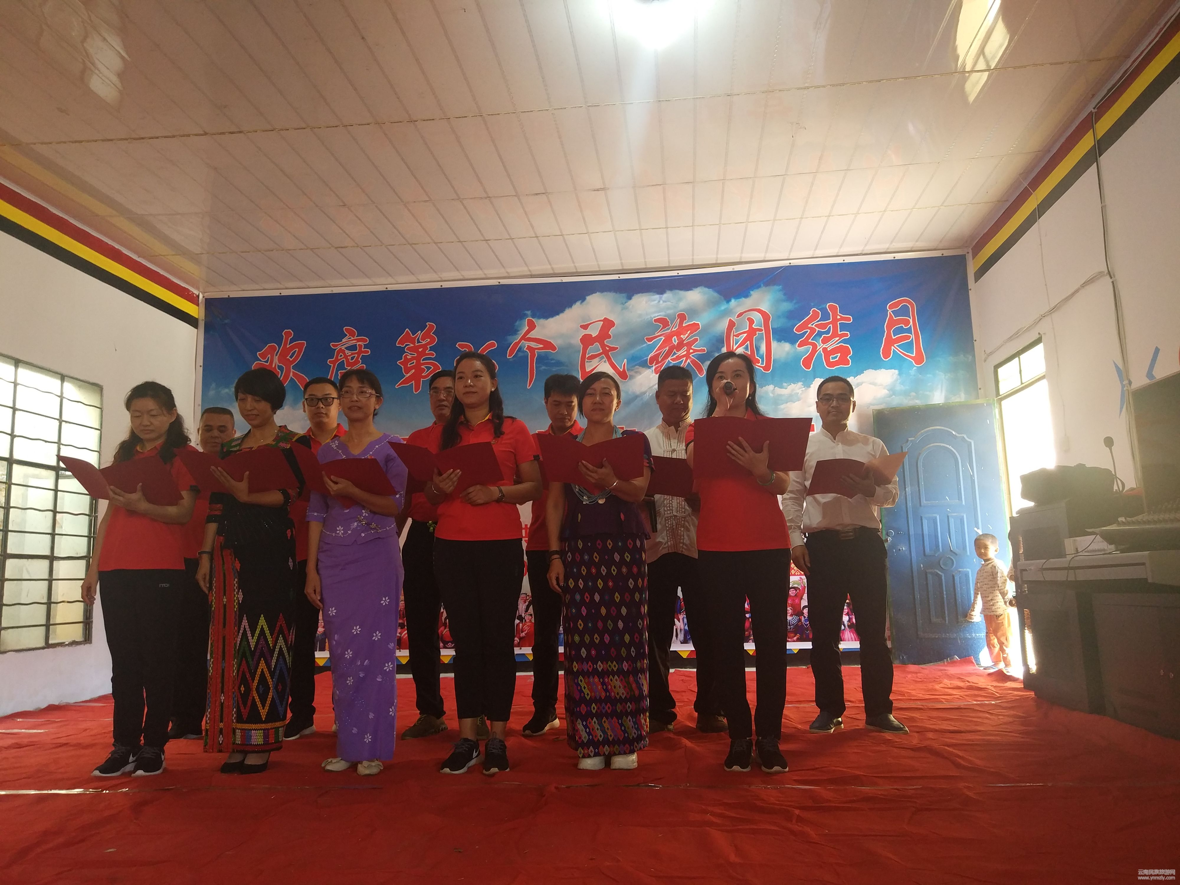 10月26日,邦外村委會活動室,表演臺上德昂歌舞、景頗歌舞、詩歌朗誦,臺下掌聲雷動。德宏州委黨校聯(lián)合芒市三臺山德昂族鄉(xiāng)到掛鉤村邦外村委會開展以“爭創(chuàng)全國民族團結(jié)進步示范州·譜寫新時代民族工作新篇章”為主題的第36個民族團結(jié)月聯(lián)歡活動, “民族理論、國情、省情、州情、市情、鄉(xiāng)情知識”有獎問答和歌舞表演將活動掀起一陣陣高潮。