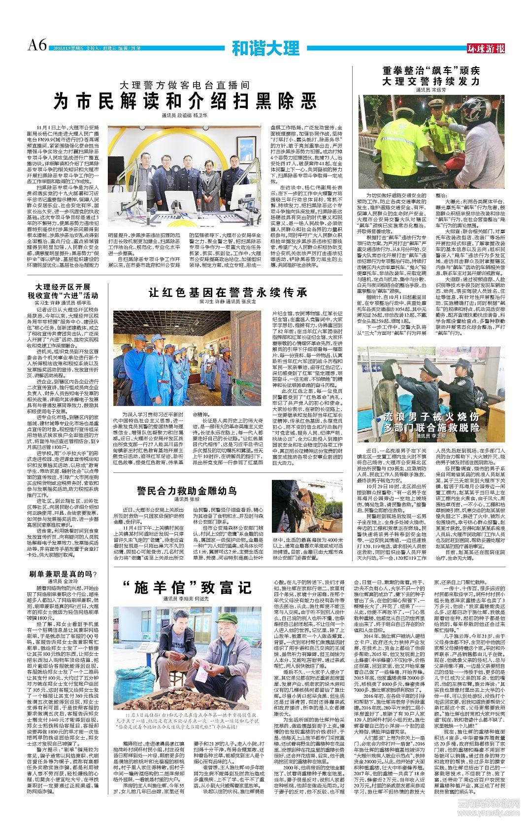 在訪談中,楊仁偉副局長(zhǎng)表示:在下一步的工作中大理警方將圍繞三年行動(dòng)總體目標(biāo),常抓不懈、持續(xù)發(fā)力,把掃黑除惡這個(gè)專項(xiàng)斗爭(zhēng)推向縱深發(fā)展。掃黑除惡這場(chǎng)硬戰(zhàn)具有突出的時(shí)代意義和現(xiàn)實(shí)意義,是一場(chǎng)人民戰(zhàn)爭(zhēng),必須依靠人民群眾和社會(huì)各界的力量積極參與。同時(shí)呼吁廣大人民群眾積極檢舉揭發(fā)涉黑涉惡違法犯罪線索,希望廣大人民群眾積極協(xié)助支持公安機(jī)關(guān)依法嚴(yán)厲打擊違法犯罪活動(dòng),鏟除黑惡勢(shì)力滋生的土壤,共同維護(hù)社會(huì)秩序。(文章來(lái)源環(huán)球游報(bào)2018年11月9日第1164期A6版)