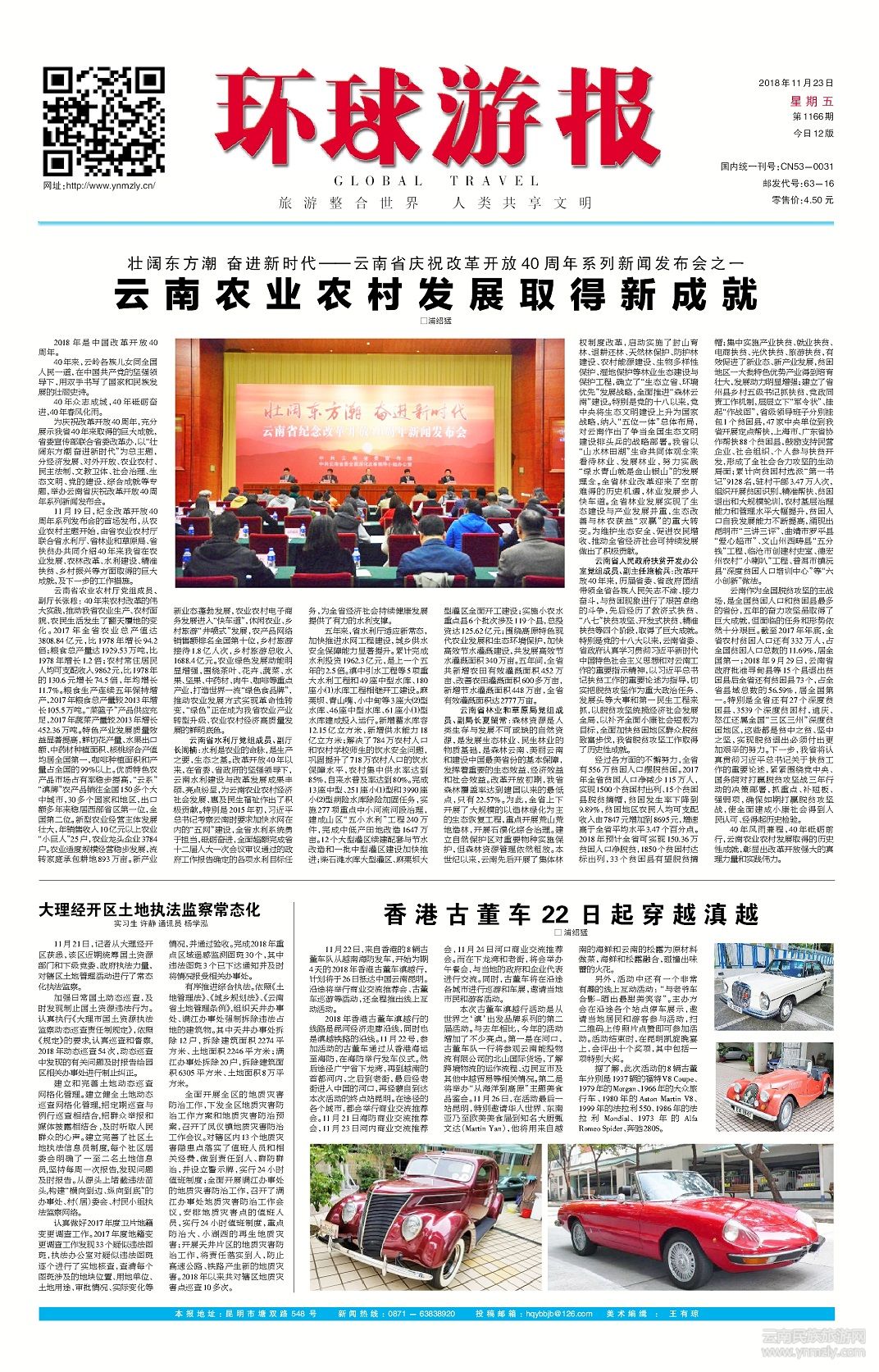 40年風(fēng)雨兼程,40年砥礪前行,云南農(nóng)業(yè)農(nóng)村發(fā)展取得的歷史性成就,彰顯出改革開(kāi)放強(qiáng)大的真理力量和實(shí)踐偉力。(文章來(lái)源環(huán)球游報(bào)2018年11月23日第1166期A1版)