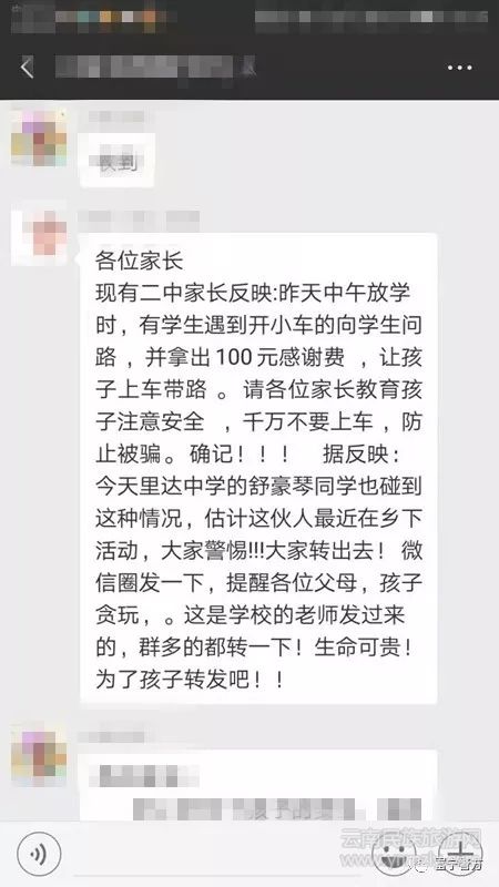 近日,富寧微信朋友圈和微信群有人在大量轉(zhuǎn)發(fā)“各位家長,現(xiàn)有二中家長反映:昨天中午放學(xué)時,有學(xué)生遇到開小車的向?qū)W生問路,并拿出100元感謝費,讓孩子上車帶路。請各位家長教育孩子注意安全,千萬不要上車,防止被騙。確記?。?!據(jù)反映:今天里達(dá)中學(xué)的舒豪琴同學(xué)也碰到這種情況,估計這伙人最近在鄉(xiāng)下活動,大家警惕?。?!大家轉(zhuǎn)出去!微信圈發(fā)一下,提醒各位父母,孩子貪玩。這是學(xué)校的老師發(fā)過來的,群多的都轉(zhuǎn)一下!生命可貴!為了孩子轉(zhuǎn)發(fā)吧?。?!”的言論。