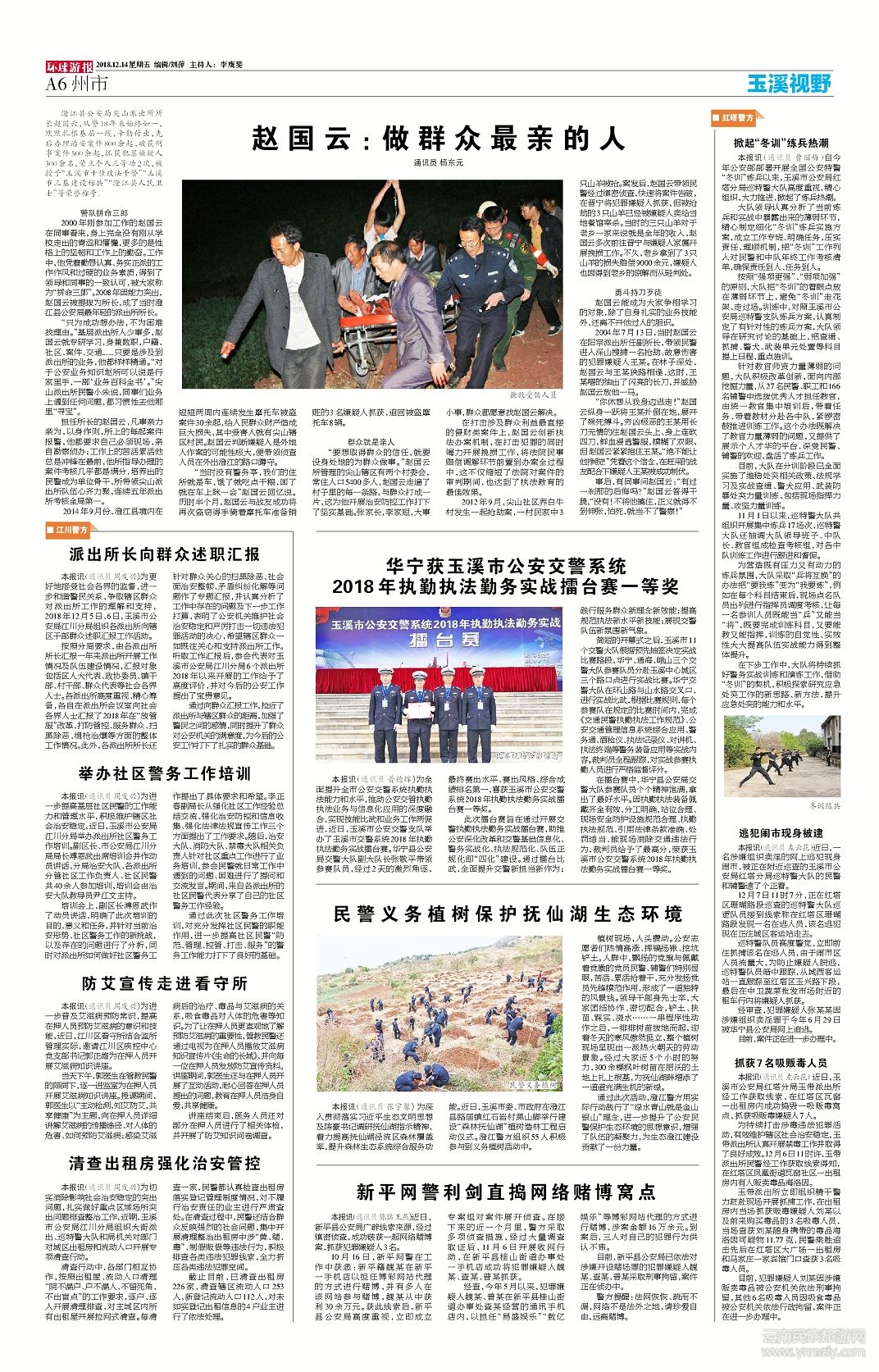 澄江縣公安局尖山派出所所長趙國云,從警18年來始終如一,默默扎根基層一線,辛勤付出,先后辦理治安案件800余起,破獲刑事案件500余起,抓獲犯罪嫌疑人300余名,榮立個人三等功2次,被授予“玉溪市十佳政法干警”“玉溪市三基建設(shè)標(biāo)兵”“澄江縣人民衛(wèi)士”等榮譽(yù)稱號。