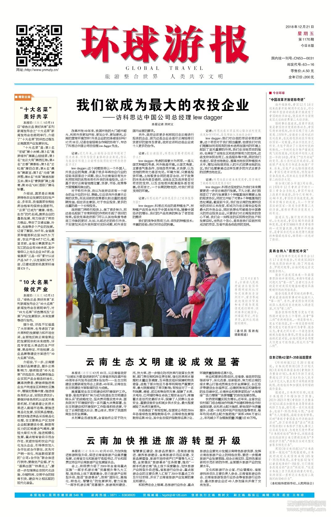 介紹說,蔬菜是云南高原特色農(nóng)業(yè)發(fā)展的支柱性產(chǎn)業(yè),多年來,我省蔬菜農(nóng)殘檢測(cè)合格率均保持全國(guó)前列,“云菜”已成為“健康、綠色、生態(tài)”的代名詞。蔬菜企業(yè)的蓬勃發(fā)展,有力促進(jìn)了勞動(dòng)力就業(yè),帶動(dòng)了交通運(yùn)輸、冷鏈、包裝等多個(gè)產(chǎn)業(yè)的發(fā)展。記者了解到,2017年,全省蔬菜種植面積達(dá)到1627.21萬畝,農(nóng)業(yè)產(chǎn)值467.7億元。截至目前,全省從事蔬菜生產(chǎn)加工的企業(yè)有400余家,其中省級(jí)以上龍頭企業(yè)167家;全省蔬菜“三品一標(biāo)”累計(jì)認(rèn)證產(chǎn)品367個(gè),認(rèn)定面積297萬畝,已建成國(guó)家級(jí)蔬菜標(biāo)準(zhǔn)園121個(gè)。(文章來源環(huán)球游報(bào)2018年12月21日第1170期A1版)