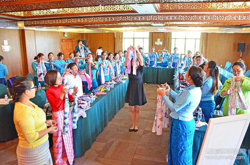 當(dāng)天,雙方婦女代表就兩國在婦女兒童領(lǐng)域所開展的工作向來賓們作了詳細(xì)介紹。云南省社科院專家歐曉鷗講解了“聯(lián)合國框架中的性別平等目標(biāo)與實(shí)踐”的內(nèi)容。芒市職業(yè)教育中學(xué)高級禮儀培訓(xùn)師李梅給大家分享了6種系絲巾的方法。在學(xué)習(xí)系絲巾的現(xiàn)場,大家都興致勃勃,紛紛模仿老師用絲巾在頭上系出一個個五彩斑斕的蝴蝶結(jié),大家互相幫忙,歡笑聲此起彼伏。最有難度的一個系法是用絲巾在胸前系出1顆愛心。大家學(xué)得格外認(rèn)真,不懂的就立馬請教老師。在老師的耐心指導(dǎo)下,婦女朋友們的胸前都綻放出了“愛心”。緬甸木姐地區(qū)婦女聯(lián)合會主席杜莫度丁指著自己的“愛心”絲巾說道:“這顆愛心也象征著中緬婦女的情誼,源遠(yuǎn)流長。”