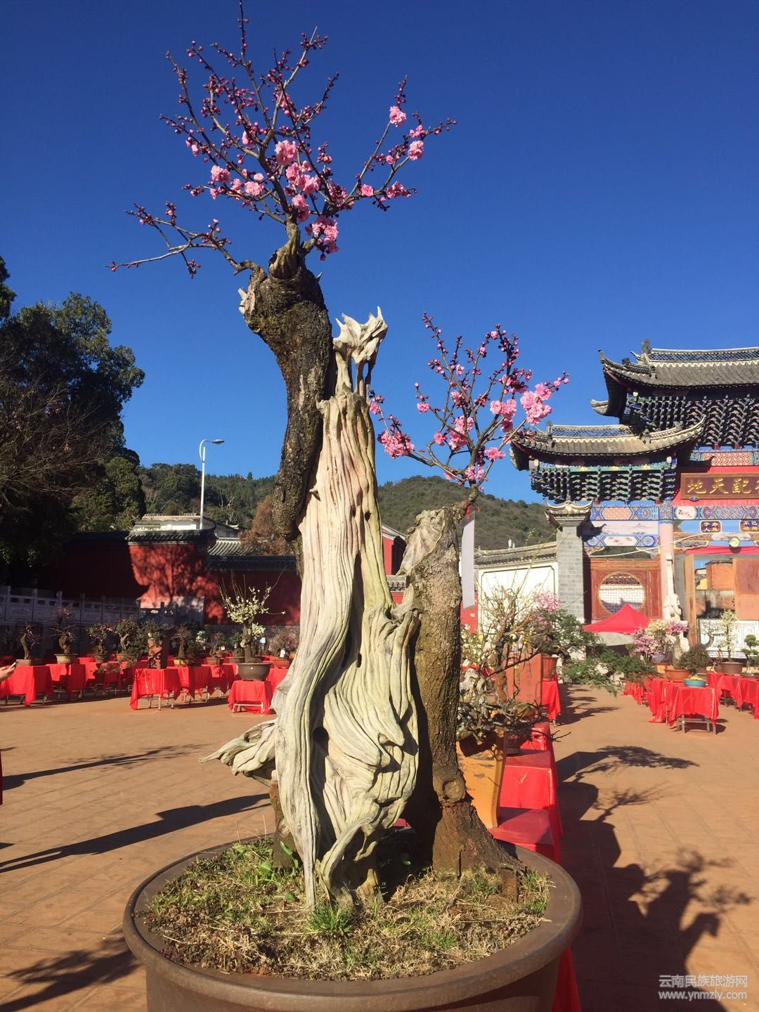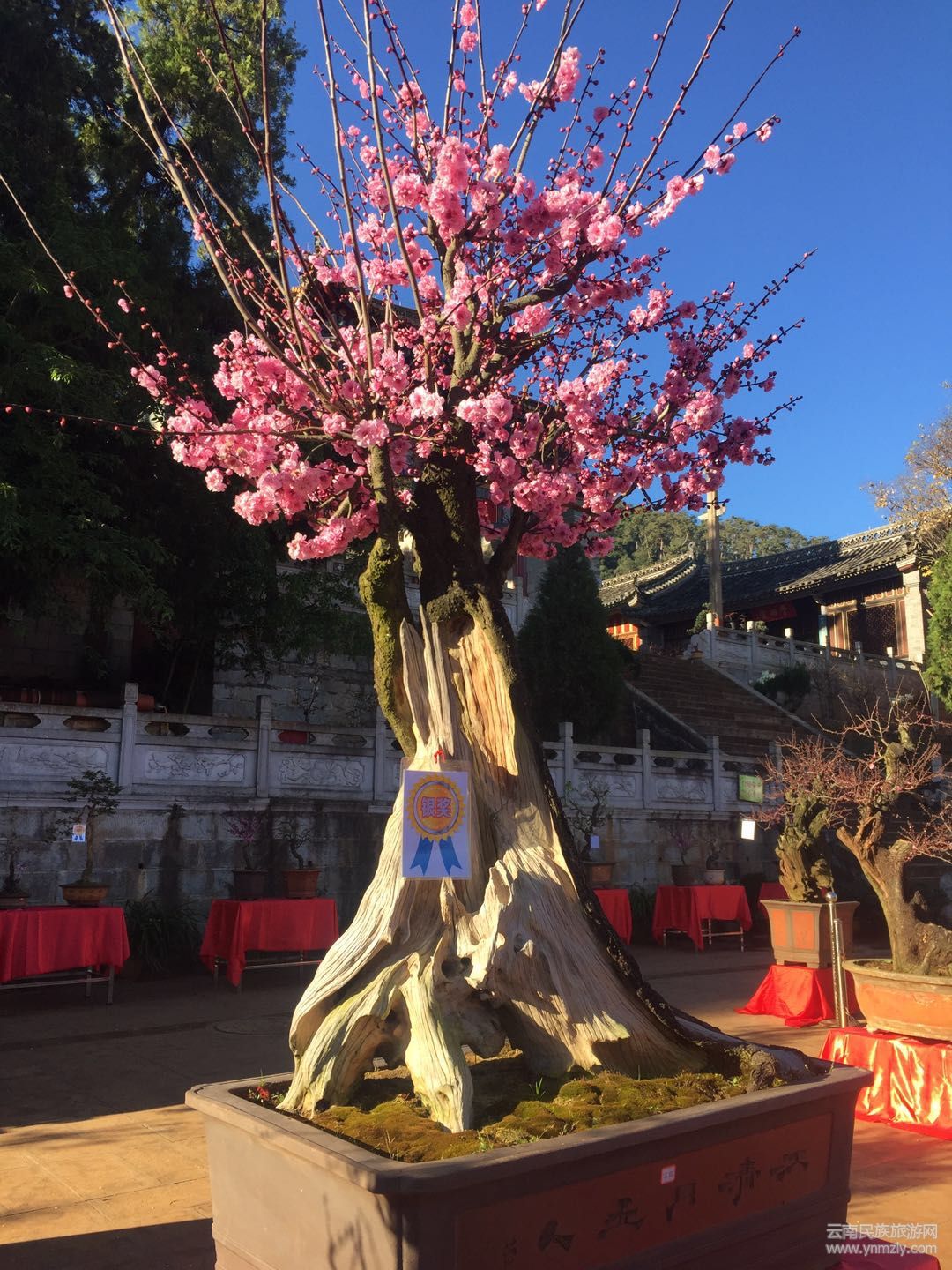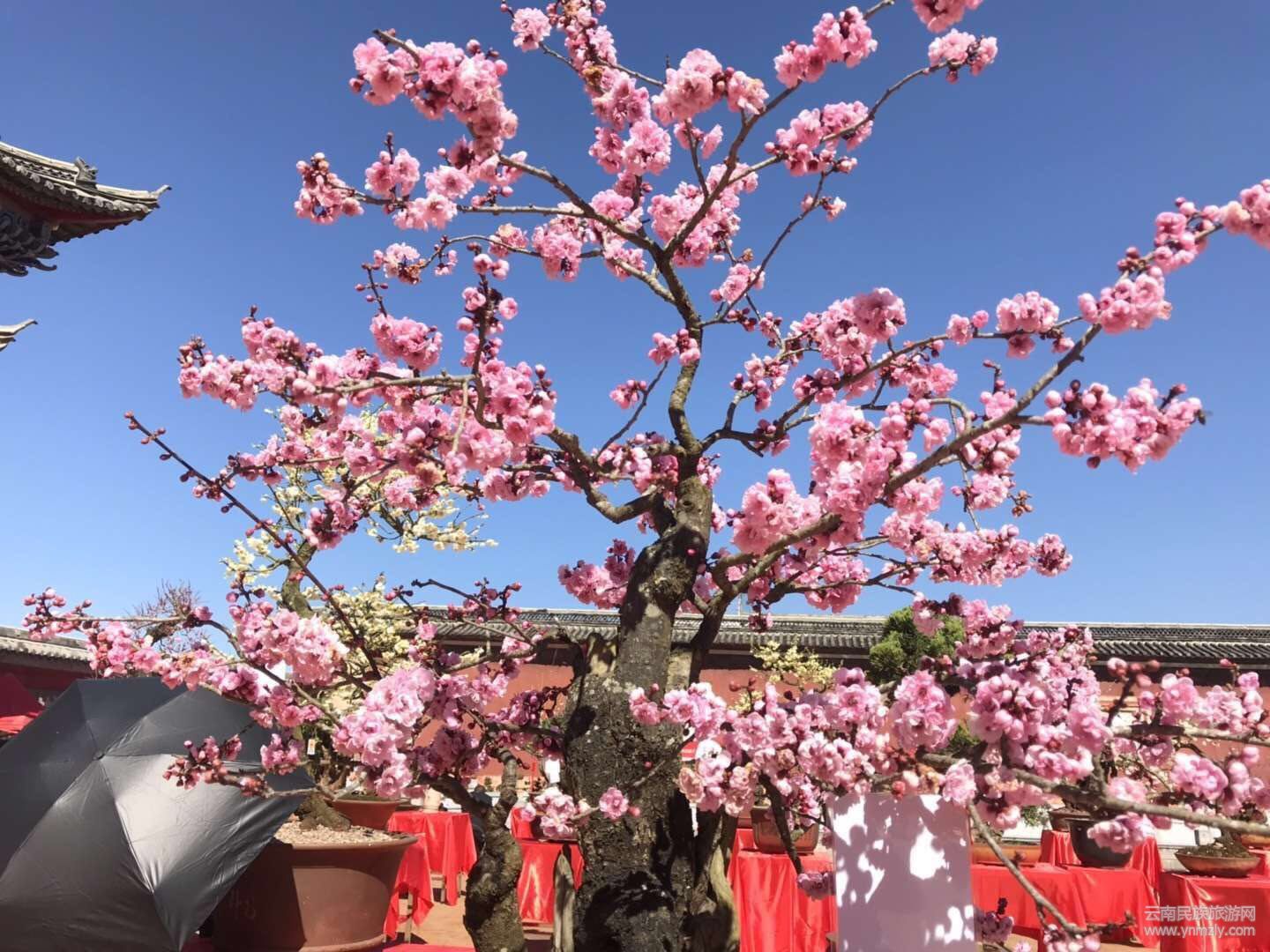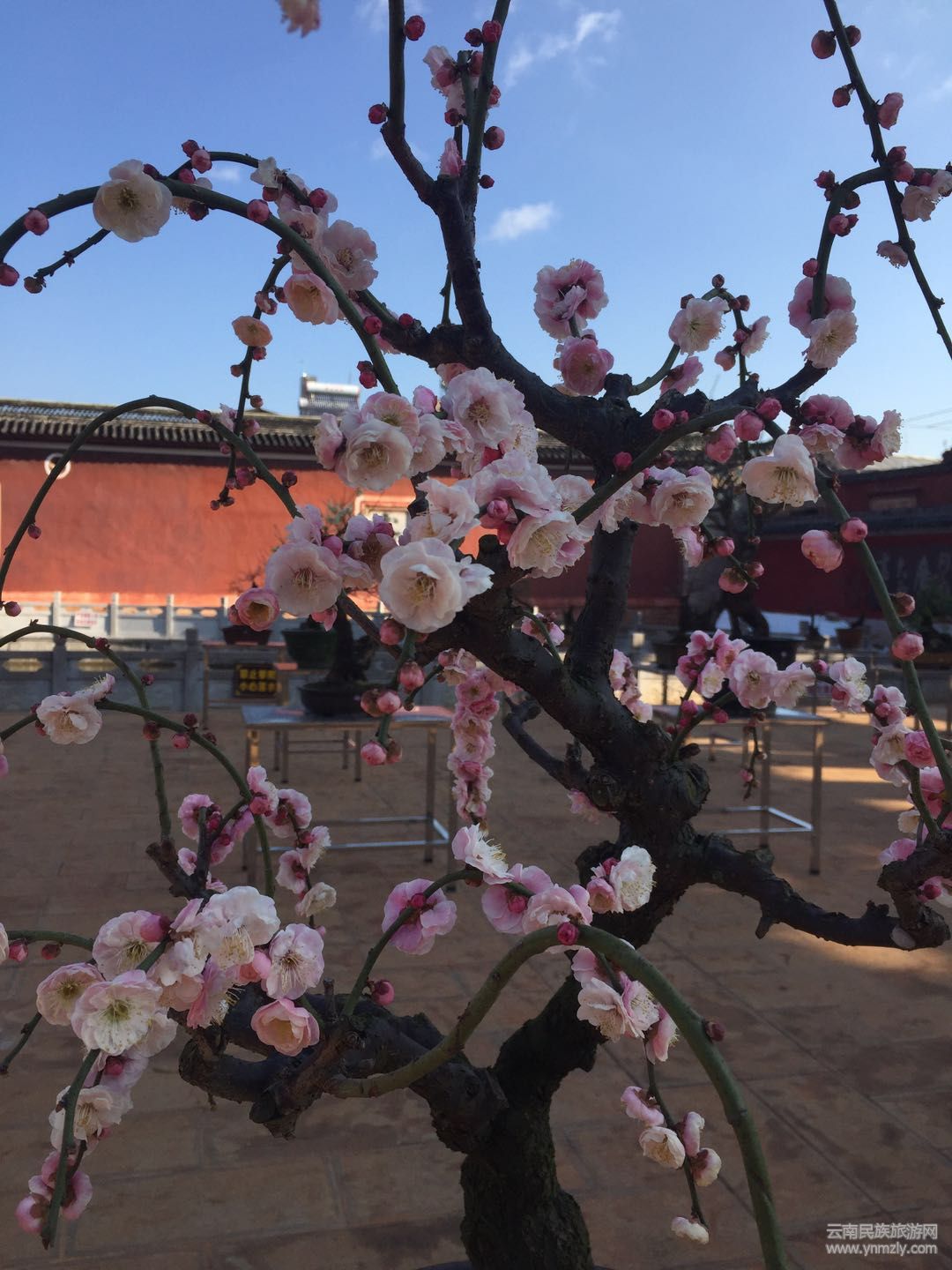 在明媚的春光中,走進(jìn)建筑別致、環(huán)境幽靜、空氣清新的通海文廟,以紅梅、綠萼梅、宮粉、朱砂等梅樁為主,兼有清香、迎春、鬼柳、小石積、黃楊、杜鵑等的各種花樁盆景在錯(cuò)落有致的展桌上各展其姿。千姿百態(tài)的盆景有的盤根錯(cuò)節(jié)、虬曲多姿,有的枝橫干斜、葉密色翠;有的或氣勢磅礴、或小巧玲瓏、或別致典雅,還有的繁華與古樸蒼勁的枯樹樁相映成趣,令人產(chǎn)生無限遐思。