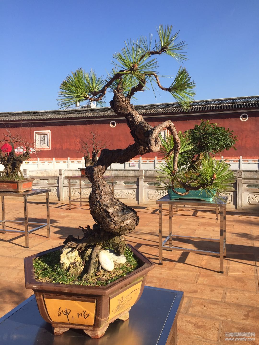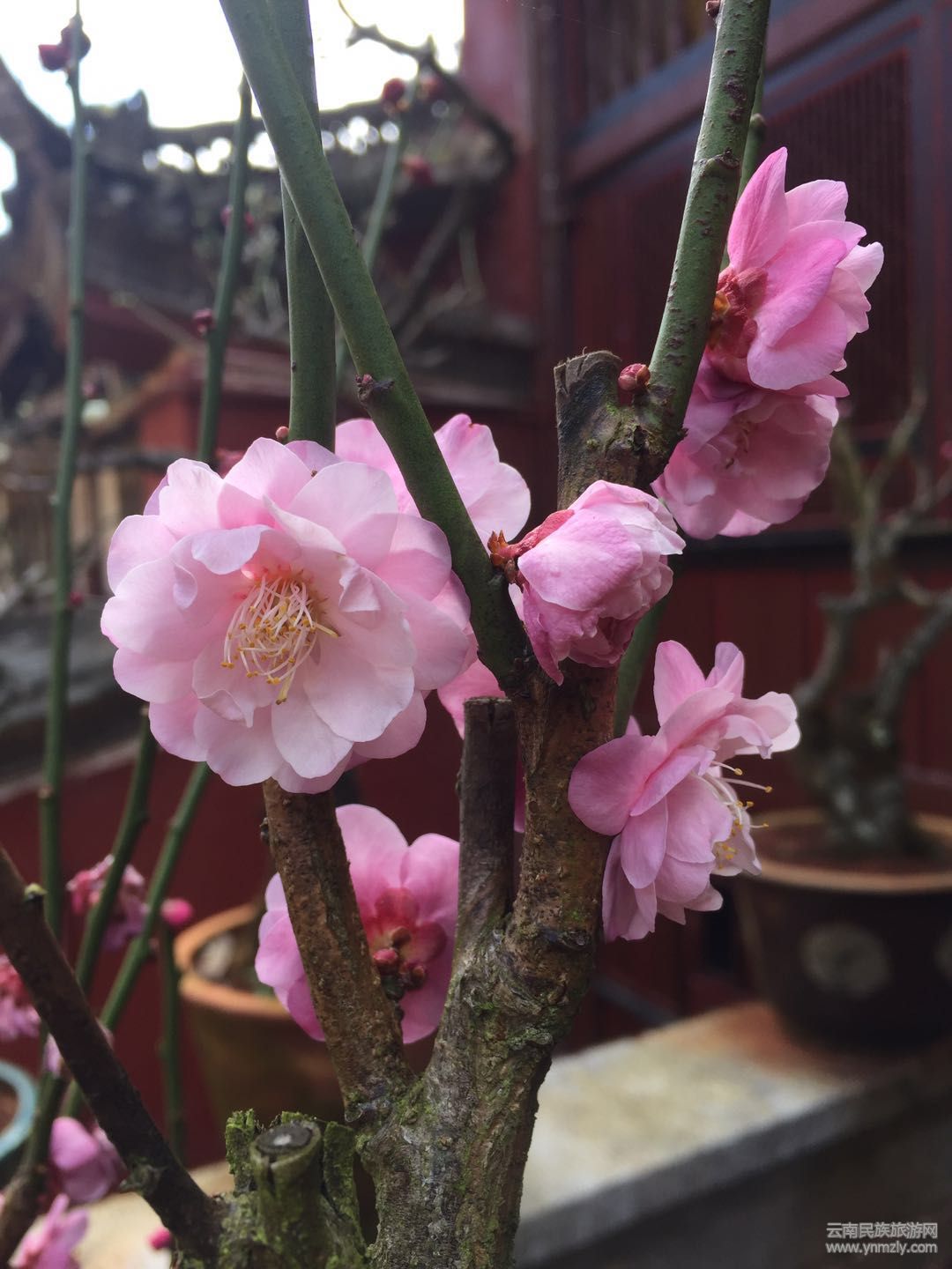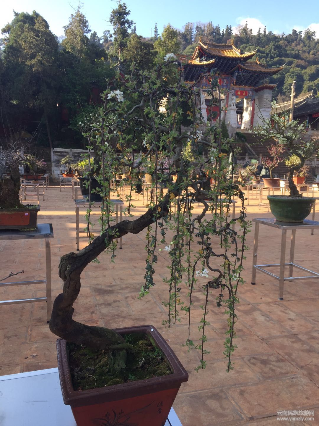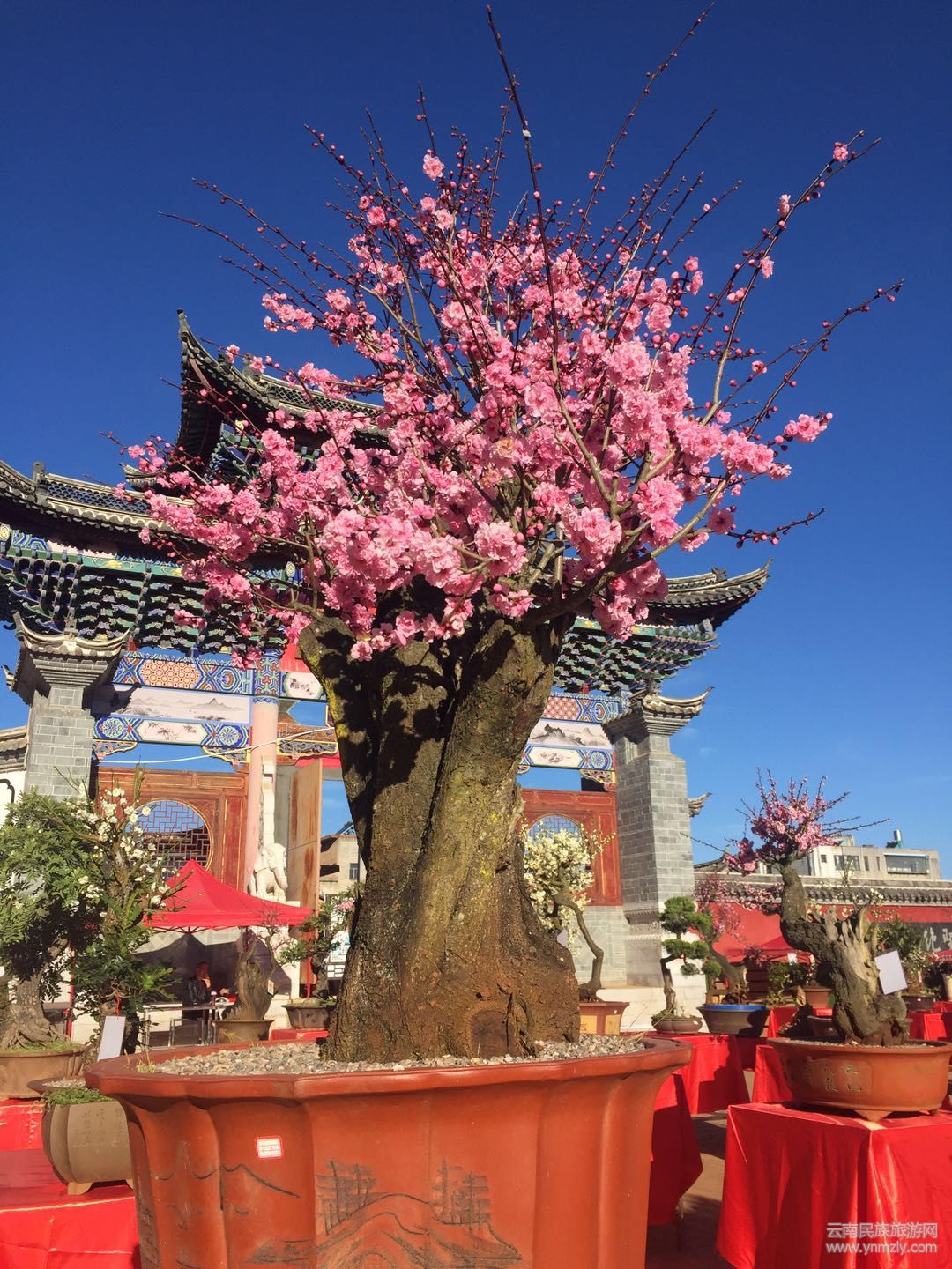 在明媚的春光中,走進(jìn)建筑別致、環(huán)境幽靜、空氣清新的通海文廟,以紅梅、綠萼梅、宮粉、朱砂等梅樁為主,兼有清香、迎春、鬼柳、小石積、黃楊、杜鵑等的各種花樁盆景在錯(cuò)落有致的展桌上各展其姿。千姿百態(tài)的盆景有的盤根錯(cuò)節(jié)、虬曲多姿,有的枝橫干斜、葉密色翠;有的或氣勢磅礴、或小巧玲瓏、或別致典雅,還有的繁華與古樸蒼勁的枯樹樁相映成趣,令人產(chǎn)生無限遐思。