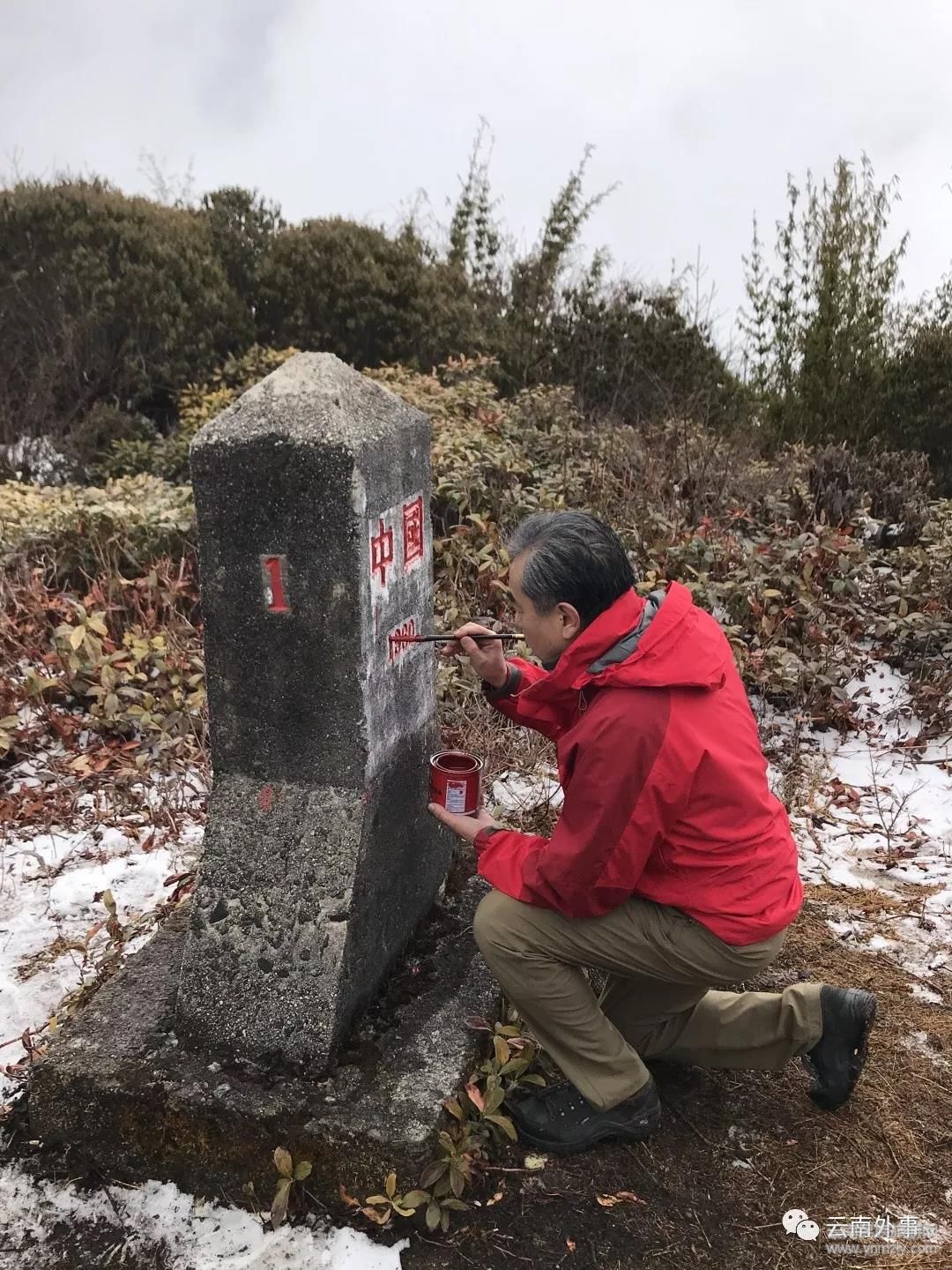 被稱為“共和國(guó)1號(hào)碑”的中緬1號(hào)界樁位于云南省保山市騰沖市。王毅一行徒步從石城埡口出發(fā),冒著漫天風(fēng)雪,踏查位于海拔2900米以上山脊峽谷的中緬邊界線,直至抵達(dá)海拔3214米的尖高山主峰中緬1號(hào)界樁。王毅仔細(xì)勘查這塊新中國(guó)第一塊界碑保存情況,親自為界樁上略已斑駁的“中國(guó)”兩字描紅添色,并向當(dāng)?shù)氐慕鐒?wù)員了解邊界日常維護(hù)情況,向基層邊界工作者致以問(wèn)候,表示感謝。