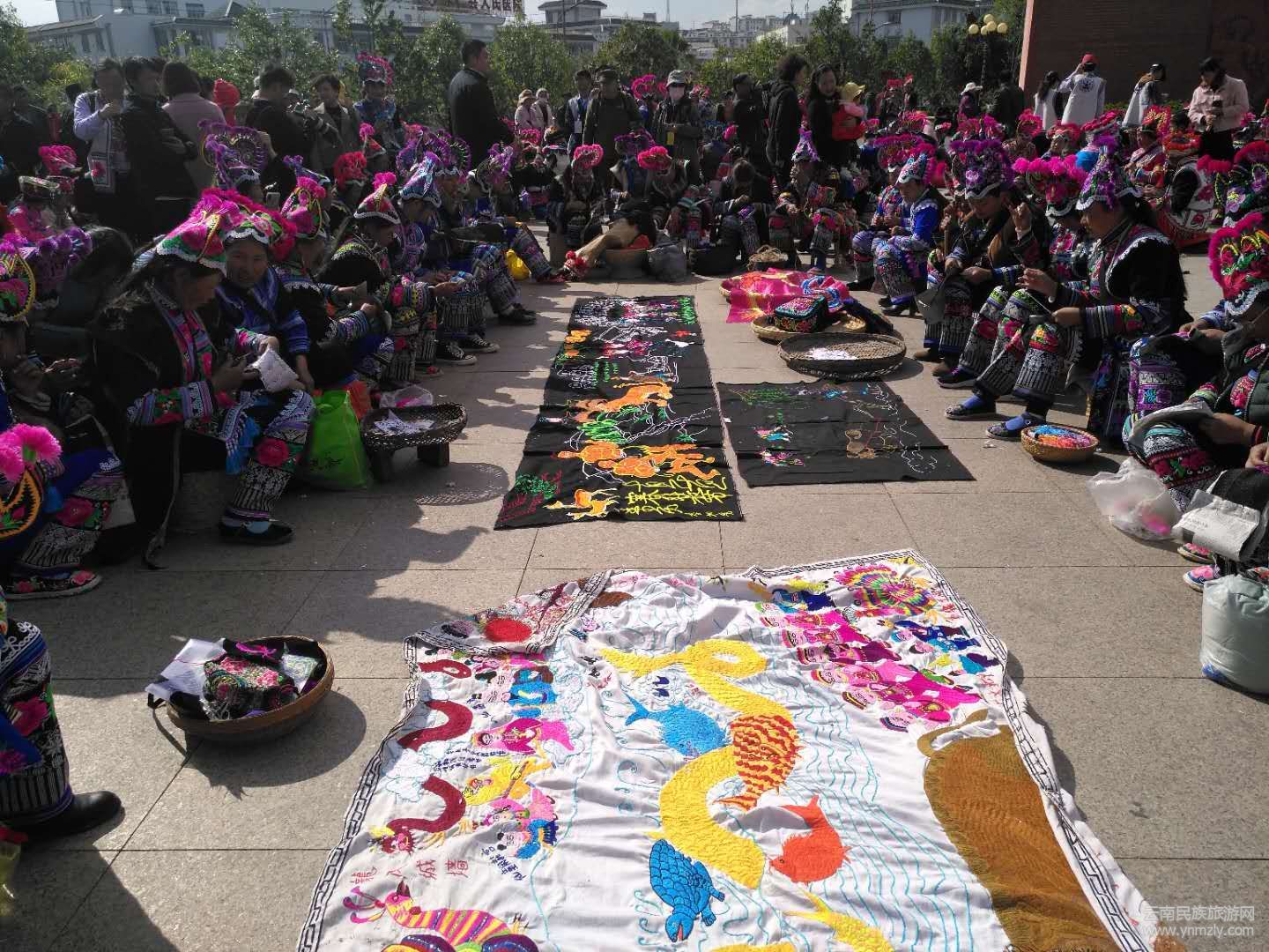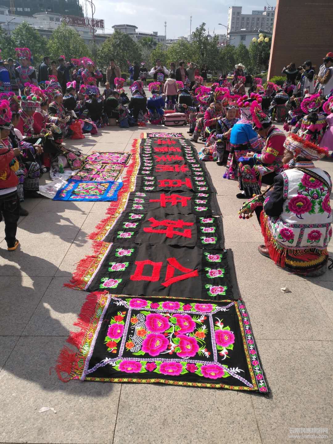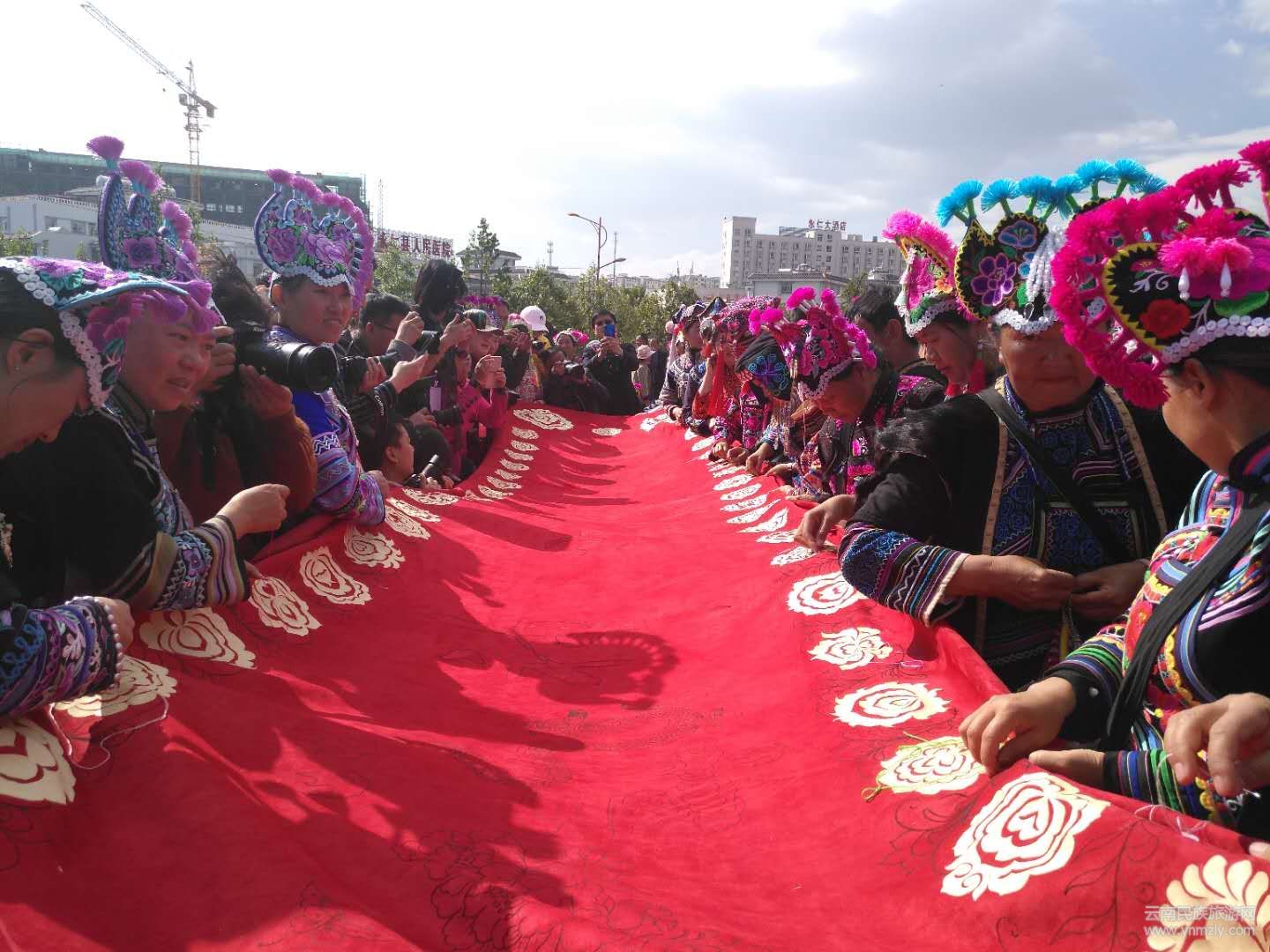 隨后,在永仁縣賽裝文化廣場(chǎng)的“賽裝之源”雕塑下,9位非物質(zhì)文化遺產(chǎn)傳承人和刺繡工藝大師共同為70米刺繡長(zhǎng)卷開針,上千名彝族姑娘們身著節(jié)日盛裝,齊齊舉起手中的繡花針,在長(zhǎng)卷上秀出活靈活現(xiàn)的圖案,表達(dá)對(duì)偉大祖國(guó)的祝福。
