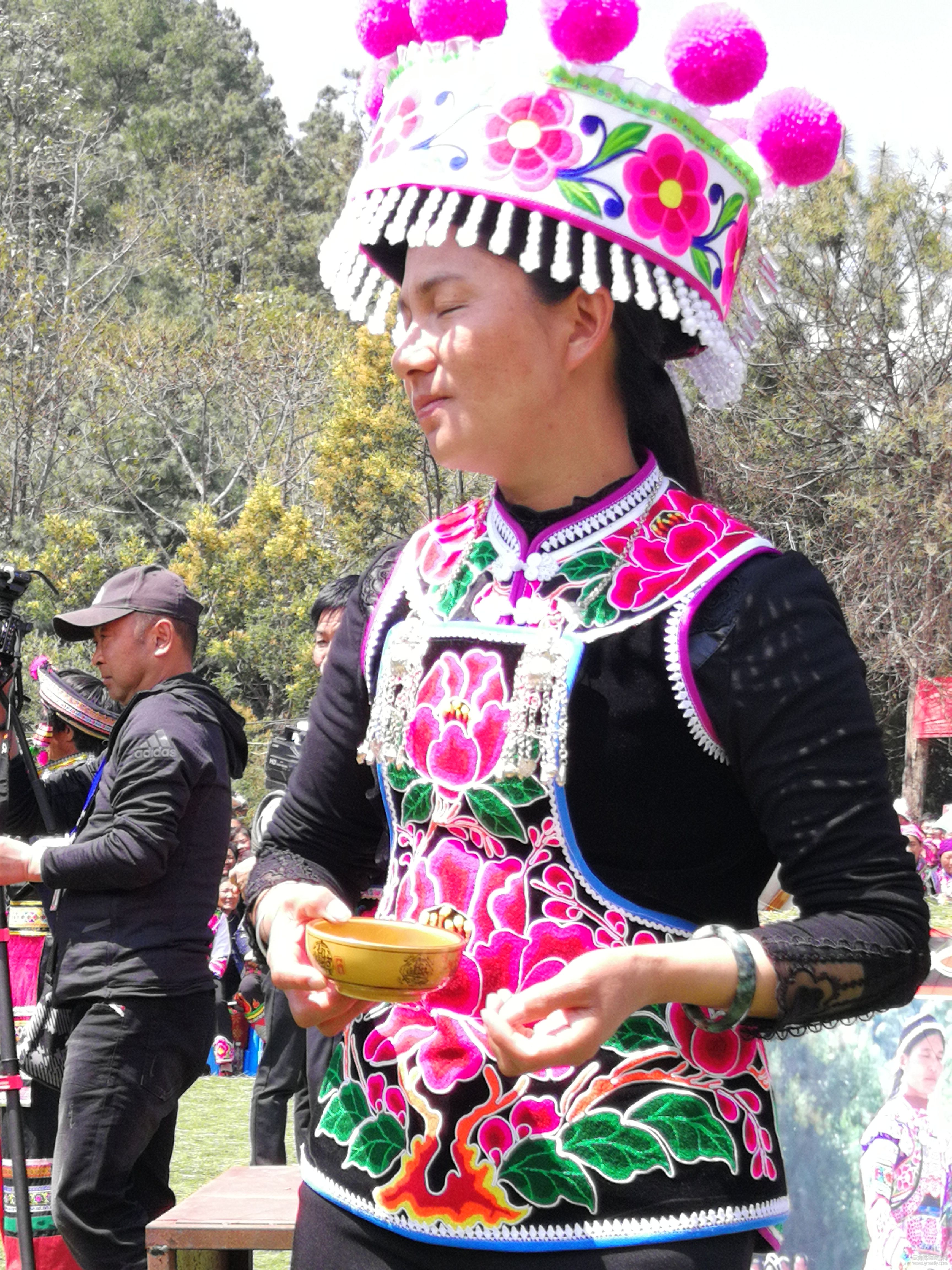 “從明朝天峰山老君殿開(kāi)山建寺后,農(nóng)歷二月十五,以彝族群眾為主體的民族歌會(huì)一直延續(xù)至今。大理州祥云縣普淜天峰山歌會(huì),收藏于縣級(jí)公布的非物質(zhì)文化遺產(chǎn)保護(hù)(民俗)名錄,傳說(shuō)天峰山歌會(huì)是為了紀(jì)念彝族先祖孟獲夫人祝融。祝融在戰(zhàn)場(chǎng)上英勇善戰(zhàn),連諸葛亮都曾敗于她的手下。生活中,她教導(dǎo)彝族婦女做衣紡織。于是,每年在她生日農(nóng)歷二月十五這天,聚居于此的彝族同胞都會(huì)穿上盛裝,以傳統(tǒng)生態(tài)歌舞的形式來(lái)紀(jì)念孟獲夫人。”祥云縣民宗局民族股股長(zhǎng)楊叢英介紹說(shuō)。