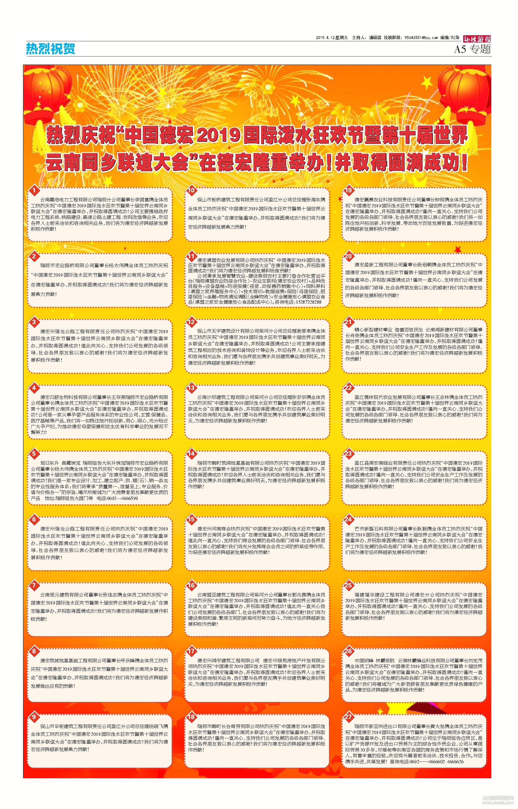2.瑞麗市宏業(yè)路橋有限公司董事長(zhǎng)楊太偉攜全體員工熱烈慶祝“中國(guó)德宏2019國(guó)際潑水狂歡節(jié)暨第十屆世界云南同鄉(xiāng)聯(lián)誼大會(huì)”在德宏隆重舉辦,并祝取得圓滿(mǎn)成功!我們將為德宏經(jīng)濟(jì)跨越新發(fā)展鼎力貢獻(xiàn)!