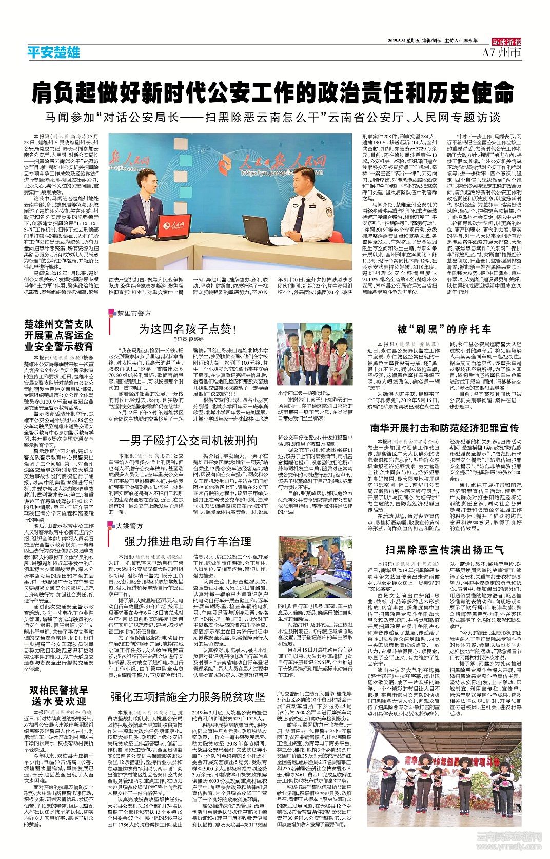訪談中,馬聞結(jié)合楚雄州地處云南中部、多民族聚居等特點,系統(tǒng)闡述了楚雄州公安機(jī)關(guān)在州委、州政府和省公安廳黨委的堅強(qiáng)領(lǐng)導(dǎo)下,創(chuàng)新建立掃黑除惡“1+10+10+5+N”工作機(jī)制,扭轉(zhuǎn)了過去刑偵部門單打獨斗的被動局面,形成了“所有工作以掃黑除惡為統(tǒng)領(lǐng)、所有力量向掃黑除惡聚集、所有資源為掃黑除惡服務(wù)、所有成效以人民滿意為標(biāo)準(zhǔn)”的良好工作格局,并就階段性戰(zhàn)果進(jìn)行概述。