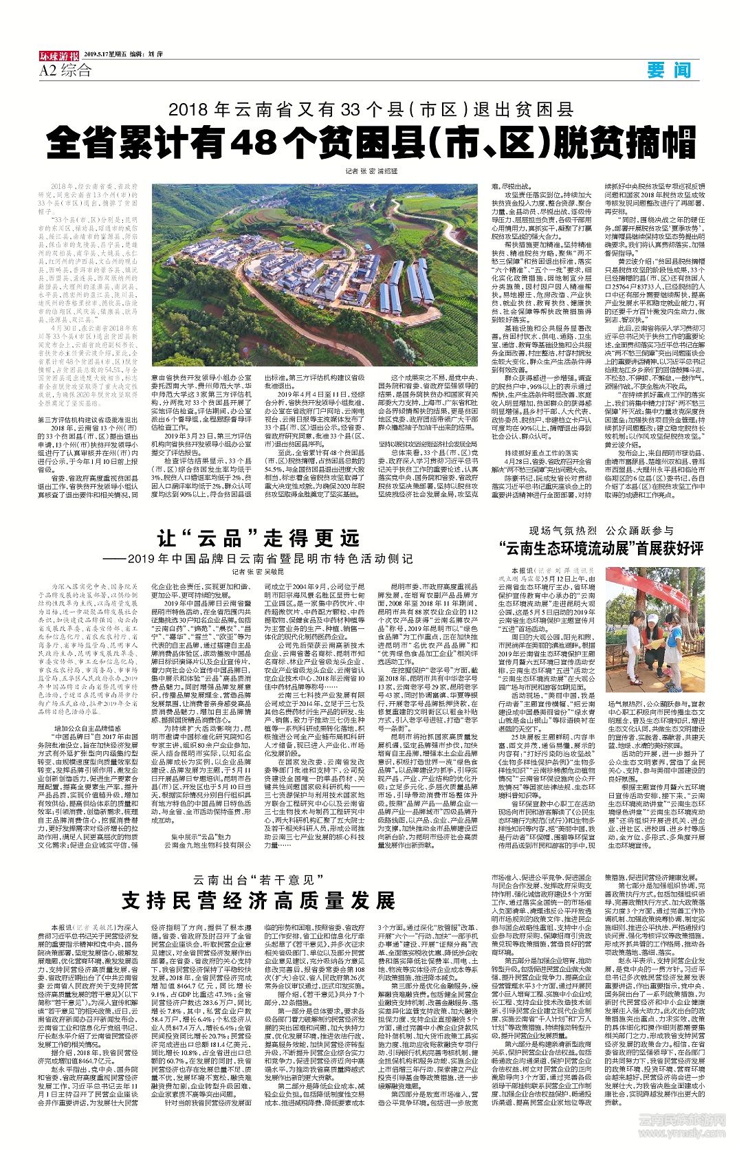 發(fā)布會(huì)上,來(lái)自昆明市祿勸縣、曲靖市富源縣、楚雄州雙柏縣、普洱市西盟縣、大理州永平縣和臨滄市臨翔區(qū)的6位縣(區(qū))委書(shū)記,各自介紹了本縣(區(qū))在脫貧攻堅(jiān)工作中取得的成績(jī)和工作亮點(diǎn)。(文章來(lái)源環(huán)球游報(bào)2019年5月17日第1187期A2版)