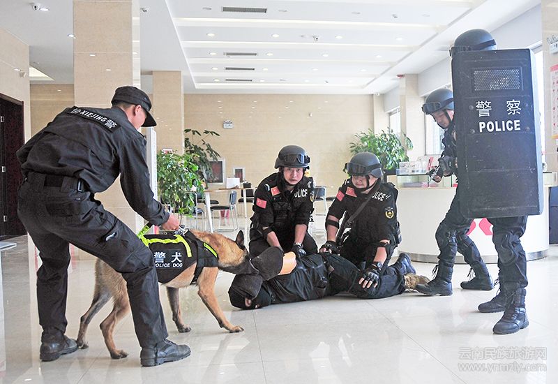 馬關(guān)縣公安局立即啟動《反恐應(yīng)急預(yù)案》,派出PTU小組前往支援。在歹徒挾持人質(zhì)意圖逃離時,PTU小組果斷出擊,將其中2名歹徒擊斃,另1名歹徒被警犬撲倒后,民警及時將其制服。事件得到成功處置,演練圓滿結(jié)束。