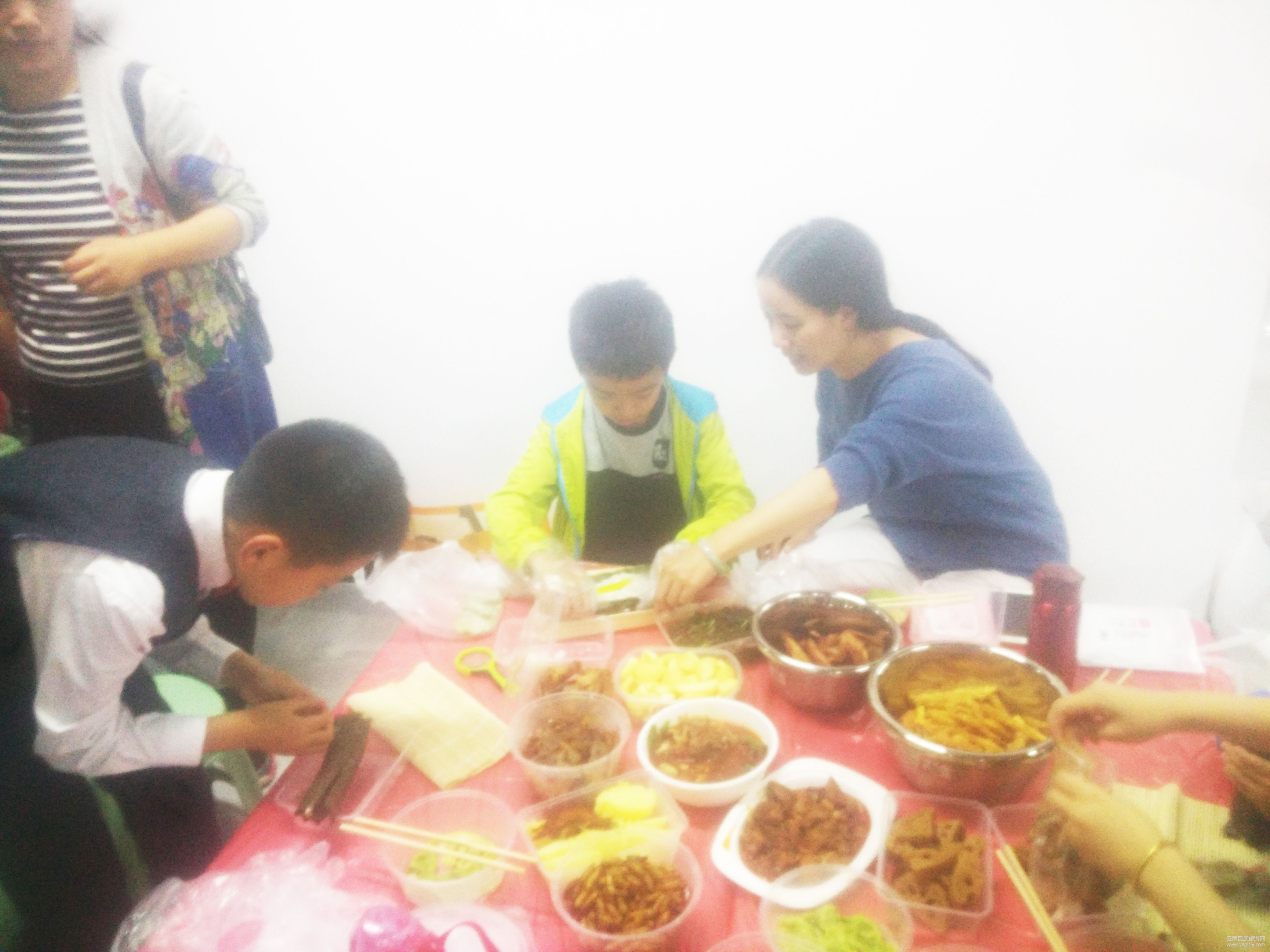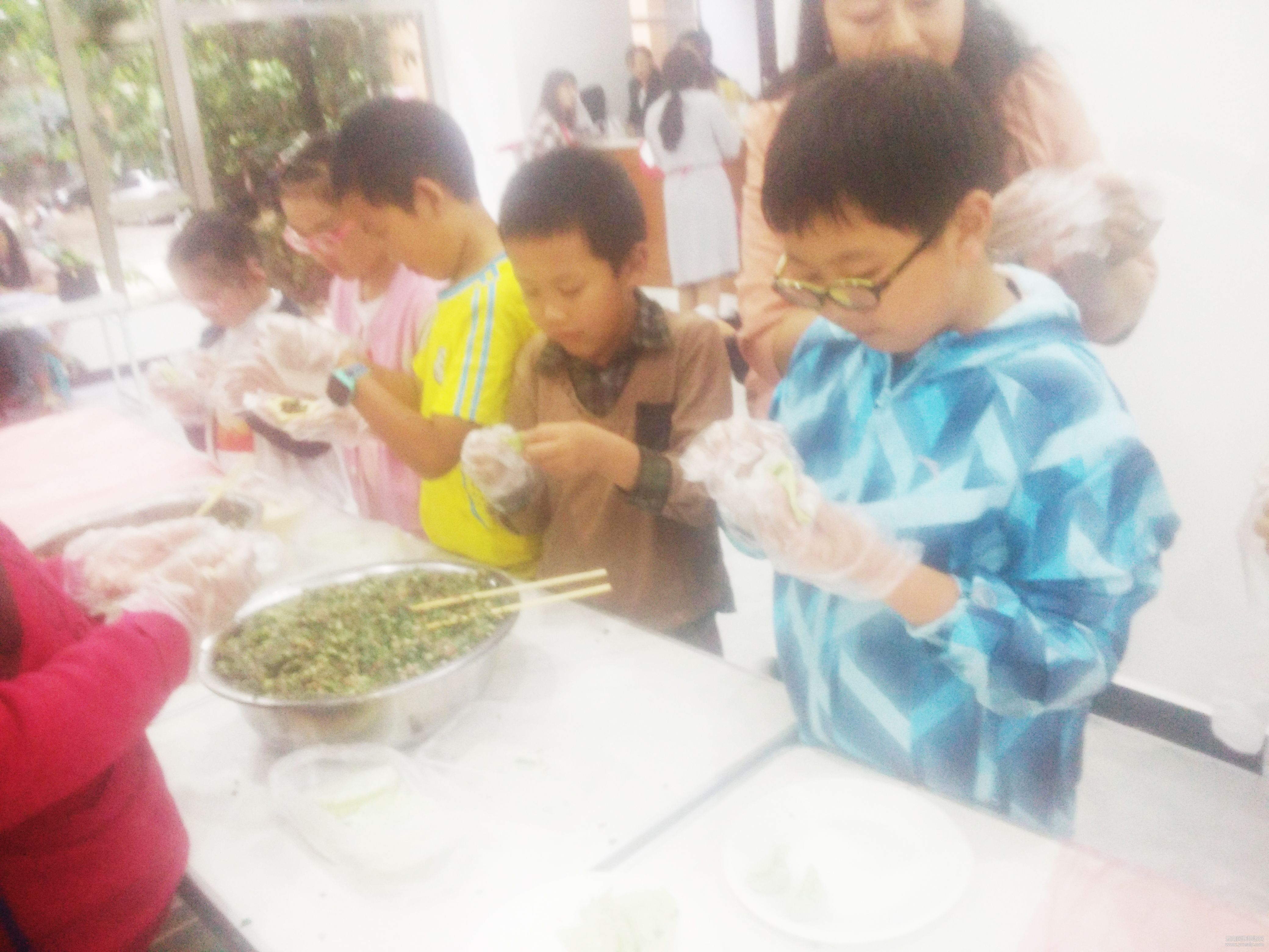 下午陰雨綿綿的天氣也沒(méi)有阻止報(bào)名家庭加活動(dòng)的熱情,社區(qū)工作人員、社工和志愿者們準(zhǔn)備好了豐富的食材、物料和玩具,并布置好現(xiàn)場(chǎng)。各個(gè)家庭也陸陸續(xù)續(xù)到場(chǎng)?,F(xiàn)場(chǎng)十分熱鬧,四五組家庭圍坐一桌,小朋友們拿出各自帶來(lái)的食物一起分享。同時(shí)家長(zhǎng)帶著兒童一起包餃子、做蛋糕和裹壽司,空氣中彌漫著香氣,整個(gè)活動(dòng)現(xiàn)場(chǎng)充滿愉快的氣氛。社工和社區(qū)工作人員一起負(fù)責(zé)分發(fā)食材,煮餃子,榨果汁,整場(chǎng)活動(dòng)的重頭戲落在“春融長(zhǎng)街宴,樂(lè)享七彩情”主題大蛋糕的制作上,現(xiàn)場(chǎng)所有報(bào)名家庭都為長(zhǎng)方形三層大蛋糕的完成貢獻(xiàn)了力量。