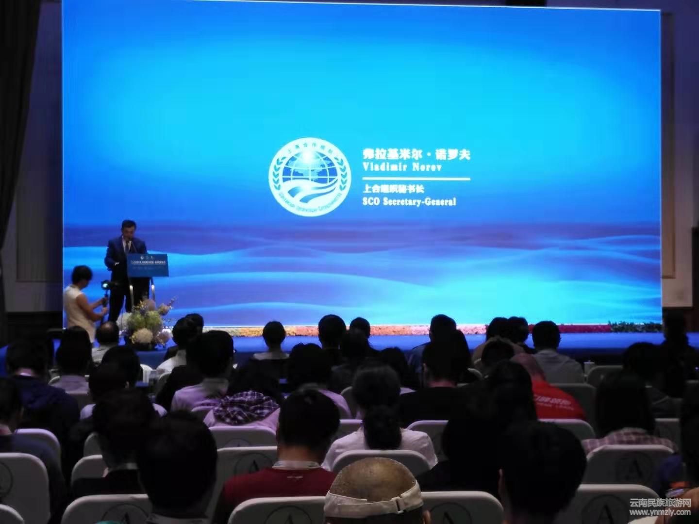 發(fā)布會上,上合組織秘書長弗拉基米爾·諾羅夫向昆明市副市長胡寶國授旗。