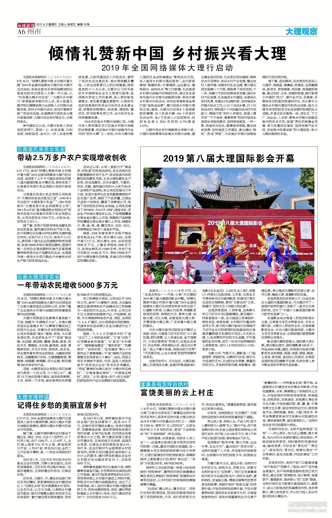 本報(bào)訊(記者 趙建云)8月17日,以“生活在別處——萬(wàn)相·眾享”為主題的2019第八屆大理國(guó)際影會(huì)開(kāi)幕。“傾情禮贊新中國(guó)鄉(xiāng)村振興看大理”2019全國(guó)網(wǎng)絡(luò)媒體大理行采訪團(tuán)有幸參與并紀(jì)錄了以攝影為橋梁、以鏡頭為紐帶,用攝影家獨(dú)有的視角、獨(dú)特的方式,聚焦大理、定格大理、記憶大理,深度發(fā)現(xiàn)大理之美、盡情創(chuàng)造大理之美、廣泛傳播大理之美的盛會(huì)。