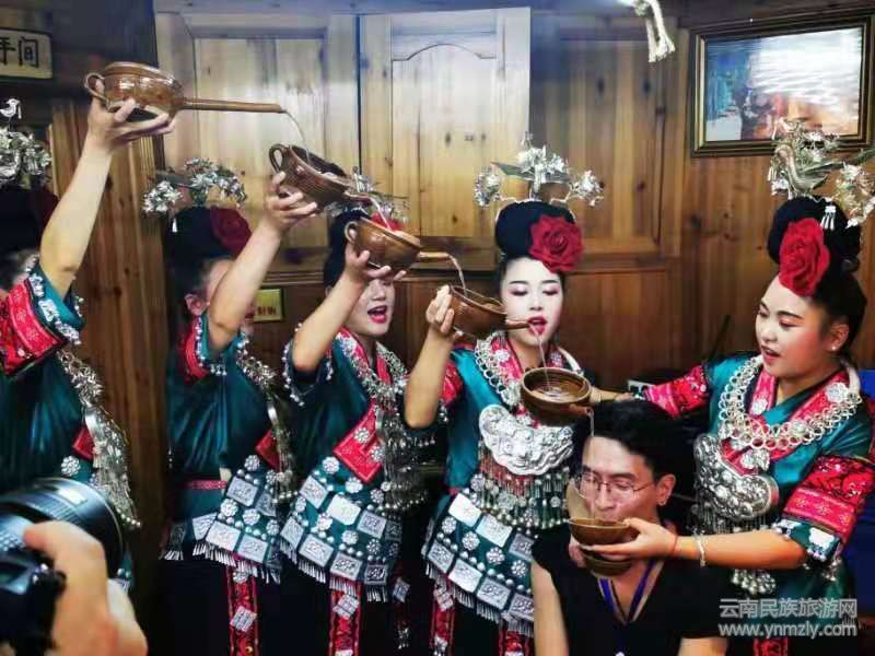 蘆笙吹起來,酒歌唱起來,身著盛裝的苗家阿妹拿著酒器、唱著酒歌,向正在用餐的游客嘉賓敬酒。她們每人手持一個酒器,從高往低依次排開,依次倒酒,酒從上往下流,形成高山流水之狀。苗族有“無酒不成席”之說,而“高山流水”就體現(xiàn)了苗族獨特的酒文化。