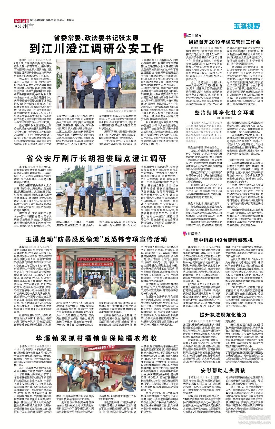 張?zhí)瓡涍€對(duì)澄江縣公安局開展建國(guó)70周年大慶安保維穩(wěn)工作進(jìn)行了檢查指導(dǎo),要求進(jìn)一步提高政治站位,加強(qiáng)統(tǒng)籌謀劃,以確保建國(guó)70周年大慶安全穩(wěn)定為主線,從嚴(yán)從實(shí)從細(xì)抓好維護(hù)國(guó)家安全和社會(huì)穩(wěn)定各項(xiàng)工作,圓滿完成好各項(xiàng)安保工作任務(wù)。(文章來(lái)源環(huán)球游報(bào)2019年8月9日第1199期A8版)