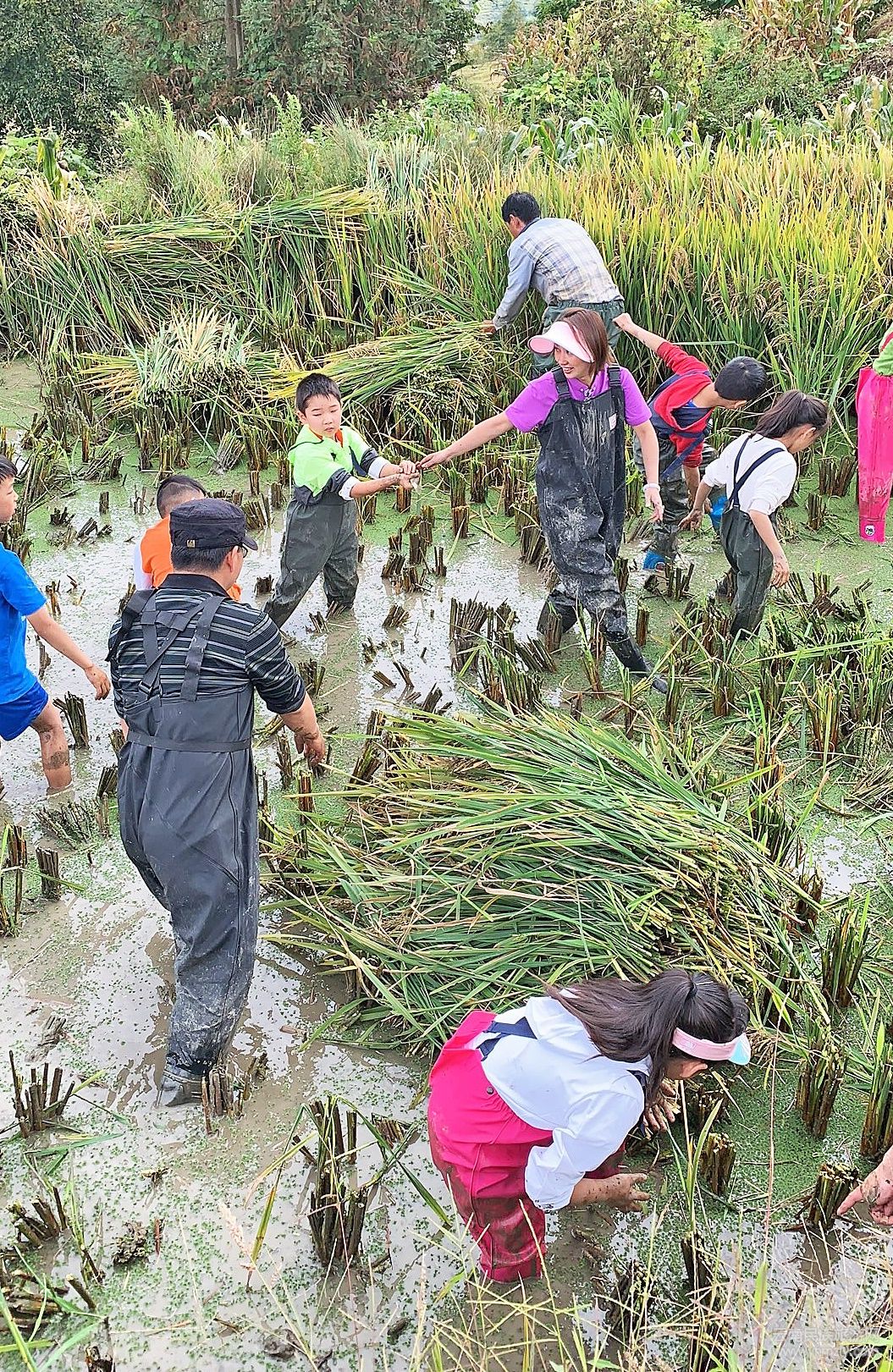 金秋十月,元陽梯田的稻谷基本收割完畢,但為了此次研學(xué)旅行,在多方協(xié)調(diào)下,為小記者們留了一塊未收割的稻田,這是一個(gè)小記者完全放松自我和家長互動(dòng)的環(huán)節(jié),因?yàn)榈咎锢锊粌H有稻谷,還有成群的稻花魚,家長們除了帶小記者體驗(yàn)收割稻谷外,還有一項(xiàng)重要任務(wù),就是進(jìn)行抓稻花魚比賽。金燦燦的稻田里,一陣陣歡聲笑語響徹田間,一條條肥美的稻花魚一躍而起,泥巴飛濺,小記者們從未有過的體驗(yàn),植入了他們的童年,家長們也拾起了那些年的童趣。