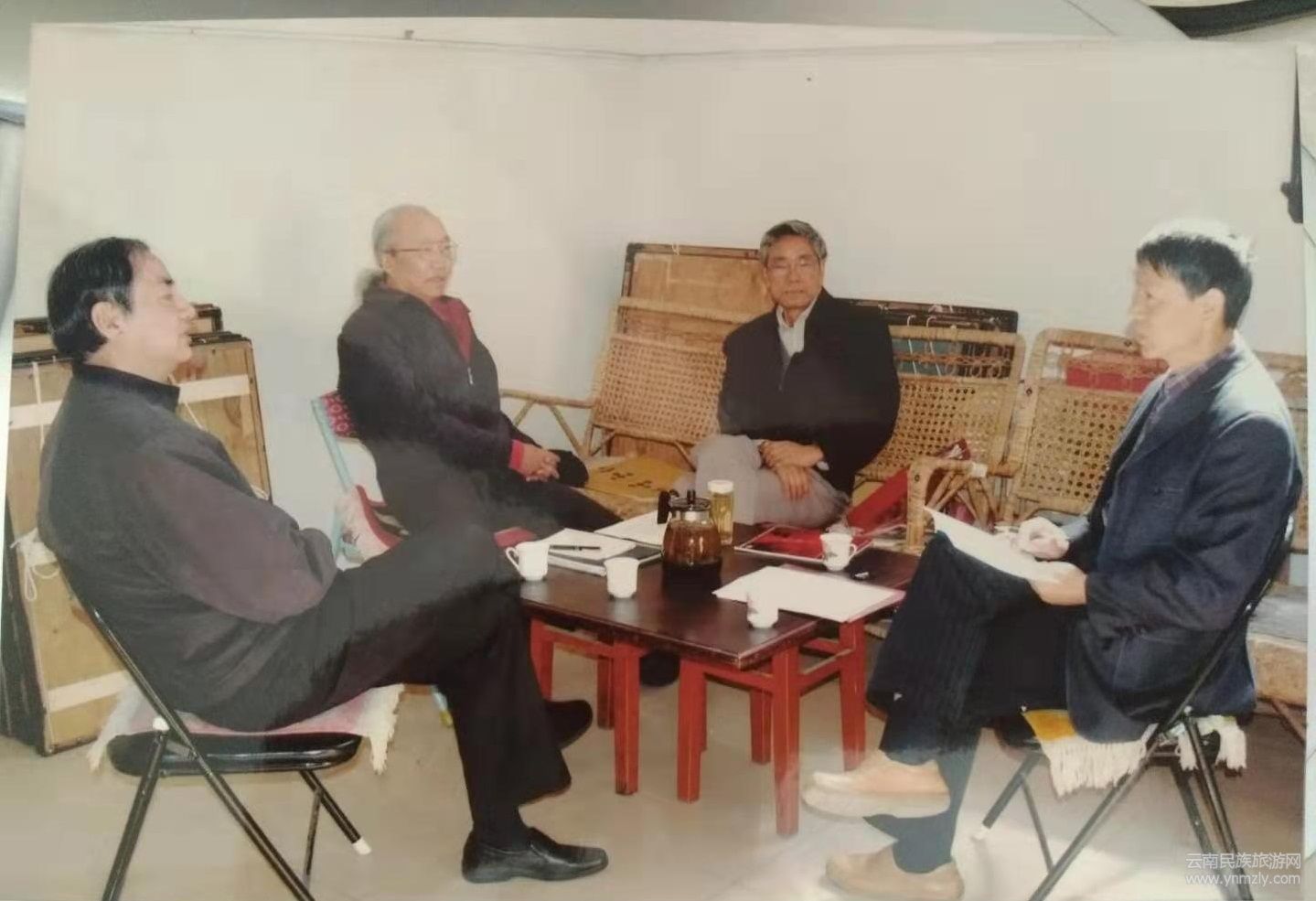 ▲熊樹文(右一)在采訪云南藝術(shù)界人士的工作情景