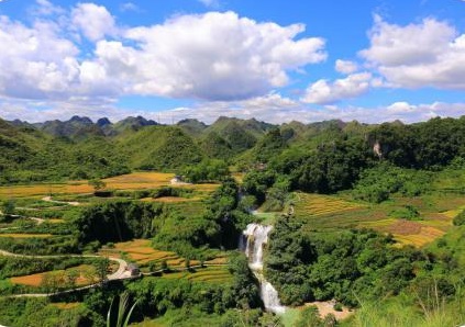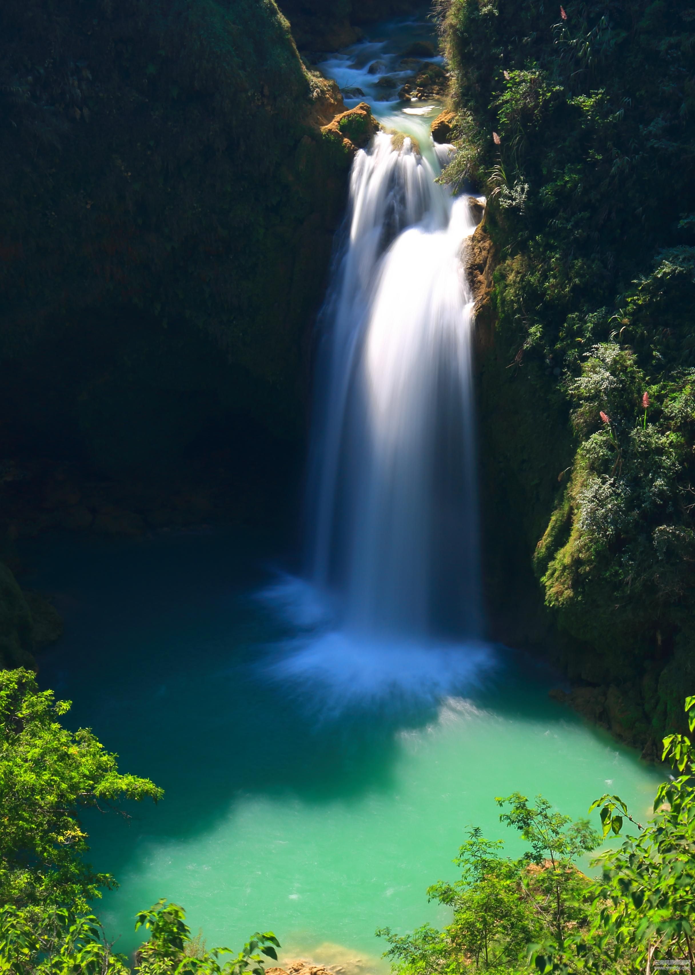 的衛(wèi)士,偉岸威武,凝神專注。大樹之上是湛藍(lán)的碧空,巖石之下是飛花的瀑影。碧空中白云如絮,朵朵飄逸,瀑影里激流如絲,條條成簾。瀑布兩側(cè)植被翠綠,苔蘚覆岸,一彎峽谷瀑聲震耳,彩虹隱現(xiàn),兩岸丘田稻谷金黃,稻香醉人。瀑流從120余米的懸崖墜下,形似不規(guī)則的“之”字,經(jīng)三級(jí)懸?guī)r激流和三溏深潭回旋后復(fù)歸常態(tài)一路奔騰流向遠(yuǎn)方。