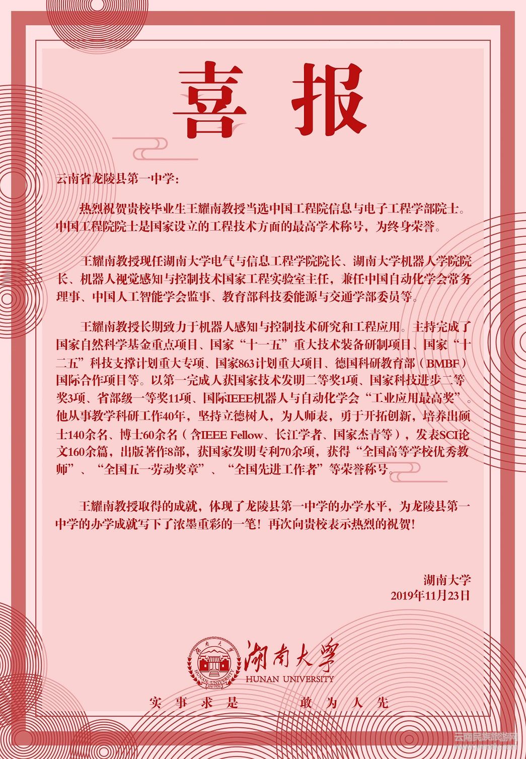 喜報說:“中國工程院院士是國家設(shè)立的工程技術(shù)方面的最高學(xué)術(shù)稱號,為終身榮譽。王耀南教授取得的成就,體現(xiàn)了龍陵縣第一中學(xué)的辦學(xué)水平,為龍陵縣第一中學(xué)的辦學(xué)成就寫下了濃墨重彩的一筆,再次向貴校表示熱烈的祝賀!”