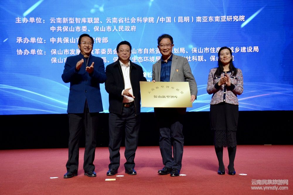 論壇現(xiàn)場,云南省新型智庫聯(lián)盟理事長、云南省社會(huì)科學(xué)院 中國(昆明)南亞東南亞研究院黨組書記、院長、研究員何祖坤同志為保山新型智庫授牌,中共保山市委宣傳部長李汶娟為授牌儀式作見證并主持下午的主題發(fā)言。