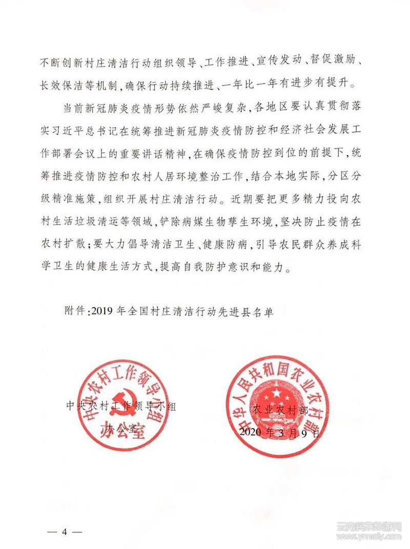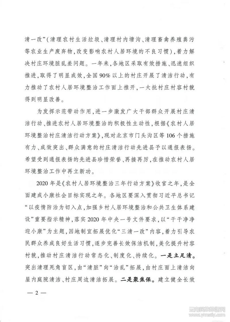 為發(fā)揮示范帶動(dòng)作用,進(jìn)一步激發(fā)廣大干部群眾開展村莊清潔行動(dòng)、推進(jìn)農(nóng)村人居環(huán)境整治的積極性主動(dòng)性,中央農(nóng)辦、農(nóng)業(yè)農(nóng)村部日前印發(fā)《關(guān)于通報(bào)表?yè)P(yáng)2019年全國(guó)村莊清潔行動(dòng)先進(jìn)縣 深入開展2020年村莊清潔行動(dòng)的通知》,對(duì)北京市門頭溝區(qū)等106個(gè)措施有力、成效突出、群眾滿意的全國(guó)村莊清潔行動(dòng)先進(jìn)縣予以通報(bào)表?yè)P(yáng),并對(duì)下一步工作作出部署安排?!锻ㄖ分赋?,2018年12月,中央農(nóng)辦、農(nóng)業(yè)農(nóng)村部等18個(gè)部門聯(lián)合印發(fā)《農(nóng)村人居環(huán)境整治村莊清潔行動(dòng)方案》。一年來(lái),各地區(qū)采取有效措施、迅速組織推進(jìn),全國(guó)90%以上的村莊動(dòng)了起來(lái),有力推動(dòng)了農(nóng)村人居環(huán)境整治工作面上推開,一大批村莊村容村貌得到明顯改善?!锻ㄖ窂?qiáng)調(diào),各地區(qū)要以“干干凈凈迎小康”為主題,推動(dòng)村莊清潔行動(dòng)常態(tài)化、制度化、持續(xù)化。立足“清”,突出清理死角盲區(qū),由“清臟”向“治亂”拓展,由村莊面上清潔向屋內(nèi)庭院清潔、村莊周邊清潔拓展。聚焦“保”,建立健全長(zhǎng)效機(jī)制,實(shí)現(xiàn)村莊由一時(shí)清潔向保持長(zhǎng)期干凈整潔轉(zhuǎn)變。著力 “改”,更加注重引導(dǎo)農(nóng)民轉(zhuǎn)變不良生活習(xí)慣,培養(yǎng)衛(wèi)生健康意識(shí)和環(huán)境保護(hù)理念。促進(jìn)“美”,將村莊清潔行動(dòng)與農(nóng)村生活垃圾污水治理、發(fā)展鄉(xiāng)村產(chǎn)業(yè)、建設(shè)文明鄉(xiāng)風(fēng)等有機(jī)結(jié)合,促進(jìn)外在美向內(nèi)在美、持續(xù)美轉(zhuǎn)變。《通知》要求,各地區(qū)要采取更加有力有效的推進(jìn)措施。明確差別化整治標(biāo)準(zhǔn),根據(jù)“清理農(nóng)村生活垃圾、清理村內(nèi)塘溝、清理畜禽養(yǎng)殖糞污等農(nóng)業(yè)生產(chǎn)廢棄物”任務(wù)完成情況,分類確定整治目標(biāo)。持續(xù)加大宣傳力度,堅(jiān)持干部帶動(dòng)、農(nóng)民出動(dòng)、社會(huì)發(fā)動(dòng)、節(jié)點(diǎn)行動(dòng),充分發(fā)揮媒體宣傳作用和群團(tuán)組織優(yōu)勢(shì),開展多形式的評(píng)比活動(dòng),將村莊清潔納入村規(guī)民約。強(qiáng)化監(jiān)督激勵(lì),通過(guò)檢查督導(dǎo)、明察暗訪、考核評(píng)比等進(jìn)一步壓實(shí)縣鄉(xiāng)責(zé)任,通過(guò)民眾隨手拍、舉報(bào)、曝光等強(qiáng)化社會(huì)監(jiān)督,通過(guò)通報(bào)表?yè)P(yáng)、獎(jiǎng)勵(lì)激勵(lì)等調(diào)動(dòng)干部群眾積極性。創(chuàng)新工作機(jī)制,不斷創(chuàng)新村莊清潔行動(dòng)組織領(lǐng)導(dǎo)、宣傳發(fā)動(dòng)等工作機(jī)制,確保行動(dòng)持續(xù)推進(jìn)。
