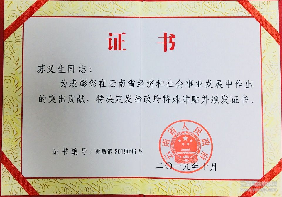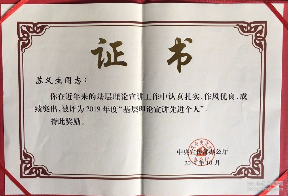 由于在脫貧攻堅(jiān)和理論宣講方面作出的貢獻(xiàn),蘇義生被評(píng)為2019年度“云南省享受省政府特殊津貼”專家、2019年度中宣部“基層理論宣講先進(jìn)個(gè)人”。