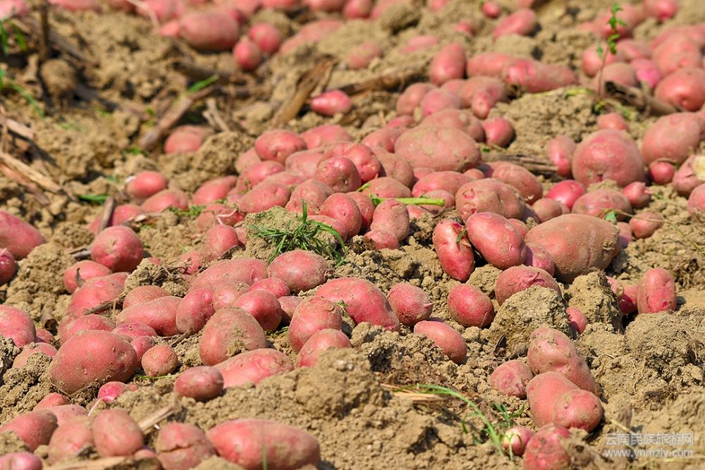 這段時(shí)間的右甸壩,挖洋芋同樣是主要的農(nóng)事,農(nóng)民們先是把還綠的洋芋樹扯到半邊,然后熟練地用鋤頭挖開,然后將一個(gè)個(gè)洋芋撿出來,用精準(zhǔn)的手法扔進(jìn)堆里。隨著鋤頭飛舞,一個(gè)個(gè)成熟的紅皮洋芋從泥土里鉆出來后,以一條條優(yōu)美的弧線,在人們的臉上飛出一個(gè)個(gè)燦爛的笑臉。